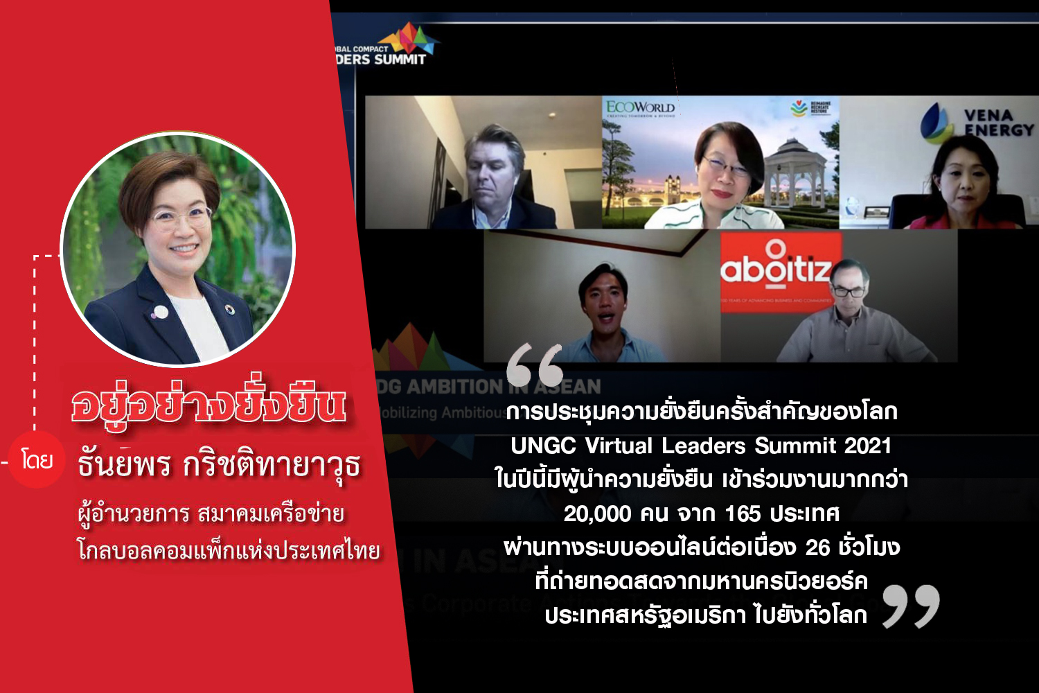 ผ่านไปแล้ว กับการประชุมความยั่งยืนครั้งสำคัญของโลก UNGC Virtual Leaders Summit 2021 ในปีนี้มีผู้นำความยั่งยืน เข้าร่วมงานมากกว่า 20,000 คน จาก 165 ประเทศ ผ่านทางระบบออนไลน์ต่อเนื่อง 26 ชั่วโมง ที่ถ่ายทอดสดจากมหานครนิวยอร์ค ประเทศสหรัฐอเมริกา ไปยังทั่วโลก