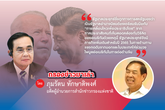 รัฐบาลประยุทธ์ซึ่งถูกทางการสหรัฐมองว่า เป็นรัฐบาลอำนาจนิยม ต้องเตรียมรับมือกับ “การเคลื่อนไหวเพื่อประชาธิปไตย” จากภาคประชาสังคมที่เห็นสอดคล้องกับวิธีคิดของอเมริกัน ด้วยเหตุนี้ รัฐบาลประยุทธ์จึงมีภารกิจเพิ่มเติมสำหรับปี 2565 ในการต้านทานแรงกดดันจากนอกและในประเทศให้ร่วมวงไพบูลย์อเมริกันในการต่อต้านจีน นอกเหนือจากต้องบริหารจัดการกับภารกิจเร่งด่วนควบคุมการแพร่ระบาดรอบห้าของโควิด 19 และการฟื้นฟูเศรษฐกิจ