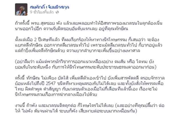 นายสมศักดิ์ เจียมธีรสกุล อาจารย์ภาควิชาประวัติศาสตร์ คณะศิลปศาสตร์ มหาวิทยาลัยธรรมศาสตร์ โพสต์ข้อความผ่านเฟซบุ๊กสมศักดิ์ เจียมธีรสกุลว่า ถ้าครั้งนี้ พรบ.สุดซอย พัง แล้วเลยพลอยทำให้อิสรภาพของมวลชนในคุกต้องเนิ่นนานออกไปอีก ความรับผิดชอบอันดับแรกเลย อยู่ที่คุณทักษิณ