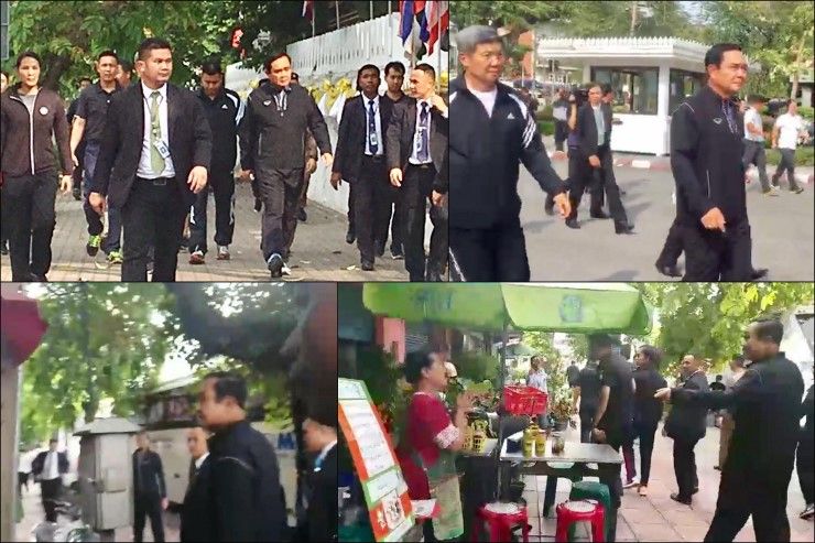 เมื่อวันที่ 25 เม.ย.  ผู้สื่อข่าวรายงานว่า ช่วงบ่ายวันนี้ พล.อ.ประยุทธ์ จันทร์โอชา นายกรัฐมนตรี และหัวหน้า คสช. ได้ลงจากตึกไทยคู่ฟ้า เพื่อมาออกกำลังกายประจำวันพุธ หลังจากที่ไม่ได้ออกกำลังกายมาเป็นเวลากว่า 2 เดือน แต่การออกกำลังกายของนายกฯไม่ธรรมดา โดยหลังจากวิ่งรอบทำเนียบและเมื่อถึงประตู 5 ด้านกระทรวงศึกษาธิการ ก็เดินออกไปภายนอก จากนั้นเดินวนรอบใหญ่ไปฝั่งตรงข้ามสำนักงานสหประชาชาติ (ยูเอ็น) และเดินเลียบคลองผดุงกรุงเกษม ผ่านวัดโสมนัสฯ เลี้ยวซ้ายสะพานเทวกรรม เข้าสู่ถนนนครสวรรค์ ผ่านแยกสนามม้านางเลิ้ง เดินกลับเข้าสู่ถนนพิษณุโลก พร้อมกับสักการะศาลกรมหลวงชุมพรเขตอุดมศักดิ์ ก่อนจะเดินเข้าประตู 2 ทำเนียบรัฐบาล โดยใช้เวลาประมาณ 30 นาที