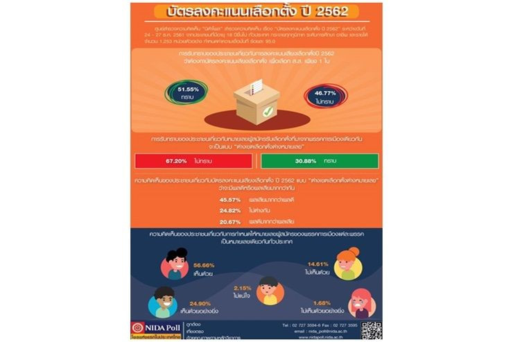 เมื่อวันที่  6 ม.ค. ศูนย์สำรวจความคิดเห็น “นิด้าโพล” สถาบันบัณฑิตพัฒนบริหารศาสตร์ (นิด้า) เปิดเผยผลสำรวจความคิดเห็นของประชาชน  เรื่อง “บัตรลงคะแนนเลือกตั้ง ปี 2562” ทำการสำรวจระหว่างวันที่ 24 – 27 ธ.ค. 2561 จากประชาชนที่มีอายุ 18 ปีขึ้นไป กระจายทุกภูมิภาค ระดับการศึกษา และอาชีพ รวมทั้งสิ้น จำนวน 1,253 หน่วยตัวอย่าง