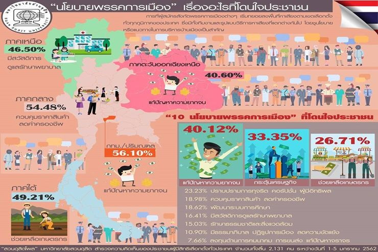 เมื่อวันที่ 6 ม.ค. สวนดุสิตโพล มหาวิทยาลัยสวนดุสิต เปิดเผยผลสำรวจความคิดเห็นของประชาชนผู้มีสิทธิเลือกตั้งทั่วประเทศ จำนวนทั้งสิ้น 2,131 คน ระหว่างวันที่ 1-5 ม.ค. 2562  เรื่อง "นโยบายพรรคการเมือง" เรื่องอะไรที่โดนใจประชาชน พบว่าอันดับ 1 คือ นโยบายแก้ปัญหาความยากจน ขึ้นเงินเดือน เพิ่มค่าแรง เน้นกินดีอยู่ดี  40.12% อันดับ 2  กระตุ้นเศรษฐกิจ พัฒนาการค้า การส่งออกและอุตสาหกรรม  33.35% อันดับ 3 ช่วยเหลือเกษตรกร แก้ปัญหาราคาพืชผลตกต่ำ ดูแลที่ดินทำกิน 26.71% อันดับ 4 ปราบปรามการทุจริต คอรัปชั่น ผู้มีอิทธิพล สิ่งผิดกฎหมาย 23.23% อันดับ 5 ควบคุมราคาสินค้าอุปโภคบริโภค ลดค่าครองชีพ  18.98%