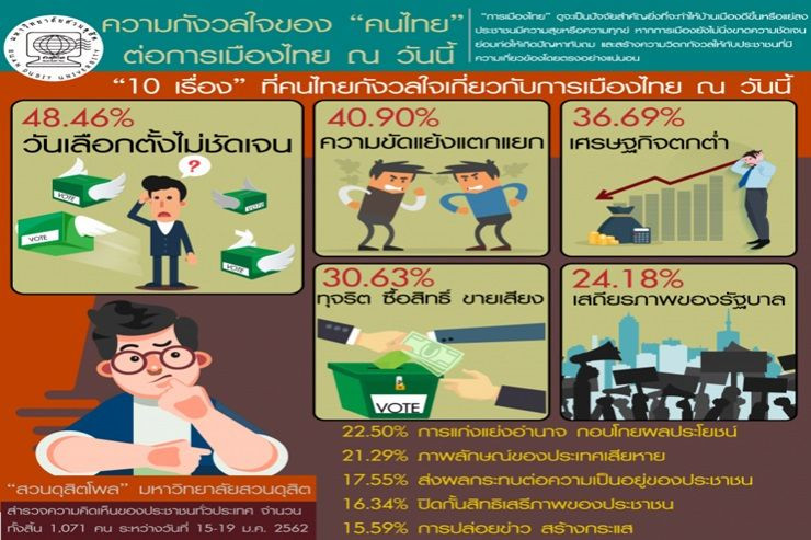 เมื่อวันที่ 20 ม.ค. 62 สวนดุสิตโพล มหาวิทยาลัยสวนดุสิต เปิดเผยผลสำรวจความคิดเห็นประชาชนทั่วประเทศ เรื่องความกังวลใจของ “คนไทย” ต่อการเมืองไทย ณ วันนี้ ซึ่ง “การเมืองไทย” ดูจะเป็นปัจจัยสำคัญยิ่งที่จะทำให้บ้านเมืองดีขึ้นหรือแย่ลง ประชาชนมีความสุขหรือ ความทุกข์ หากการเมืองยังไม่นิ่งขาดความชัดเจนย่อมก่อให้เกิดปัญหาทับถม และสร้างความวิตกกังวลให้กับประชาชนที่มีความเกี่ยวข้องโดยตรงอย่างแน่นอน เพื่อเป็นการสะท้อนความคิดเห็นของประชาชนต่อการเมืองไทย ซึ่งจากผลสำรวจจำนวนทั้งสิ้น 1,071 คน ระหว่างวันที่ 15-19 ม.ค. 2562 สรุปผลได้ ดังนี้