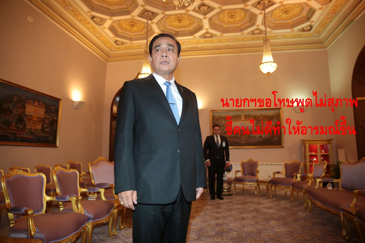 เมื่อวันที่ 1 ก.พ.62 ที่ห้องสีม่วง ตึกไทยคู่ฟ้า ทำเนียบรัฐบาล พล.อ.ประยุทธ์ จันทร์โอชา นายกรัฐมนตรีและหัวหน้าคณะรักษาความสงบแห่งชาติ(คสช.) กล่าวกับสื่อมวลชนก่อนพบอดีต 4 รัฐมนตรีในพรรคพลังประชารัฐ(พปชร.) ที่มาเทียบเชิญให้อยู่ในบัญชีนายกฯของพรรค ถึงกรณีที่ใช้วาจาไม่สุภาพในการแถลงผลงานปีที่ 4 ของรัฐบาลว่า
