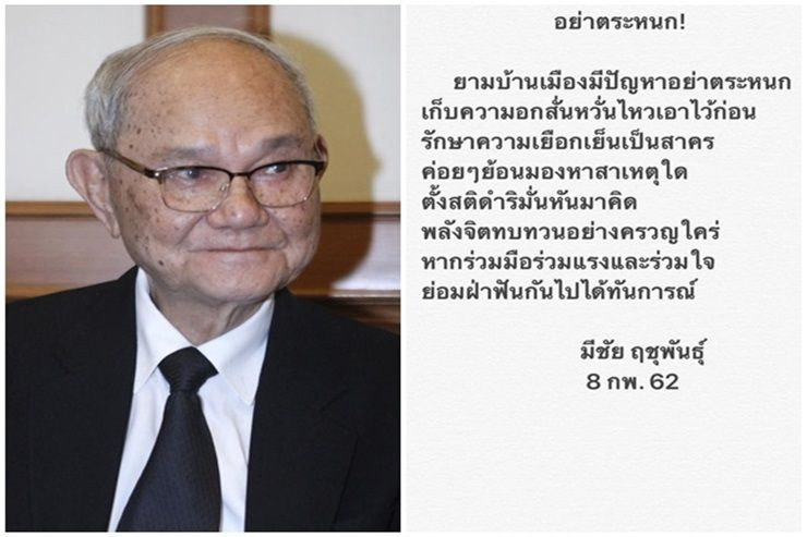 เมื่อวันที่ 8 กพ. นาย มีชัย ฤชุพันธุ์ อดีตประธานคณะกรรมการร่างรัฐธรรมนูญ (กรธ.) โพสต์บทกลอนผ่านเพจเฟซบุ๊ก คณะกรรมการร่างรัฐธรรมนูญ 2560 ระบุว่า "ยามบ้านเมืองมีปัญหาอย่าตระหนก เก็บความอกสั่นหวั่นไหวเอาไว้ก่อน รักษาความเยือกเย็นเป็นสาคร  ค่อยๆย้อนมองหาสาเหตุใด ตั้งสติดำริมั่นหันมาคิด พลังจิตทบทวนอย่างครวญใคร่ หากร่วมมือร่วมแรงและร่วมใจ ย่อมฝ่าฟันกันไปได้ทันการณ์"