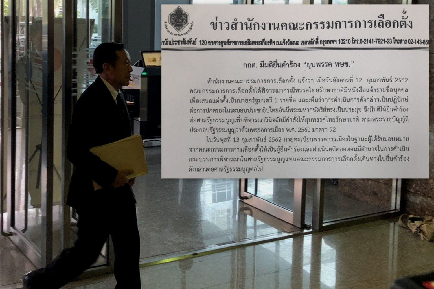เลขาฯกกต.เดินทางเข้ายื่นคำร้องต่อศาลรัฐธรรมนูญให้วินิจฉัยยุบพรรคไทยรักษาชาติ เหตุเสนอชื่อแคนดิเดตนายกฯเป็นปฏิปักษ์ต่อการปกครอง