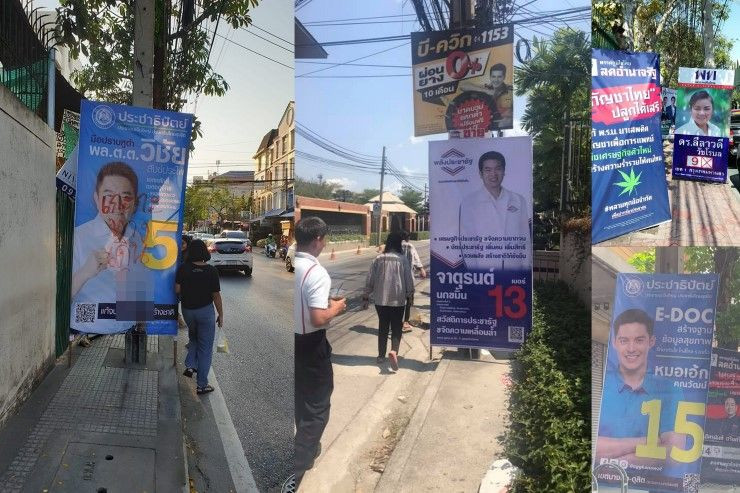 สังคมออนไลน์แชร์ประสบการณ์ป้ายหาเสียงกีดขวางทางเดินบนฟุตปาธจนประชาชนต้องลงไปเดินบนถนน
