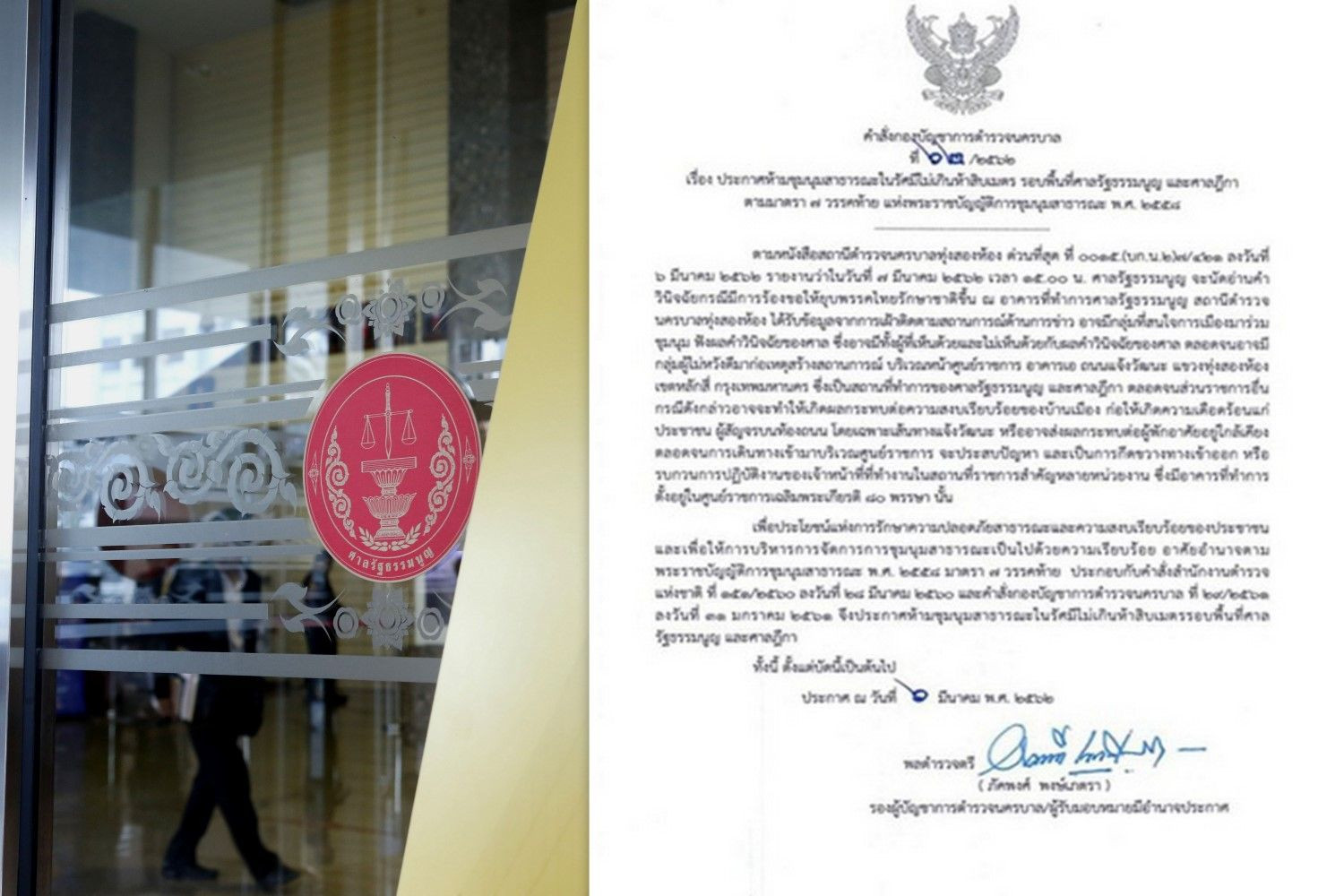 เมื่อวันที่ 7 มี.ค. 62 พล.ต.ต.ภัคพงศ์ พงษ์เภตรา รองผู้บัญชาการตำรวจนครบาล (รอง ผบช.น.) ได้ออกคำสั่งกองบัญชาการตำรวจนครบาลที่ 62/2562 เรื่อง “ประกาศห้ามชุมนุมสาธารณะในรัศมีไม่เกิน 50 เมตร รอบพื้นที่ศาลรัฐธรรมนูญ และศาลฎีกา” ตามมาตรา 7 วรรคท้ายแห่งพระราชบัญญัติการชุมนุมสาธารณะ พ.ศ. 2558 ระบุว่า