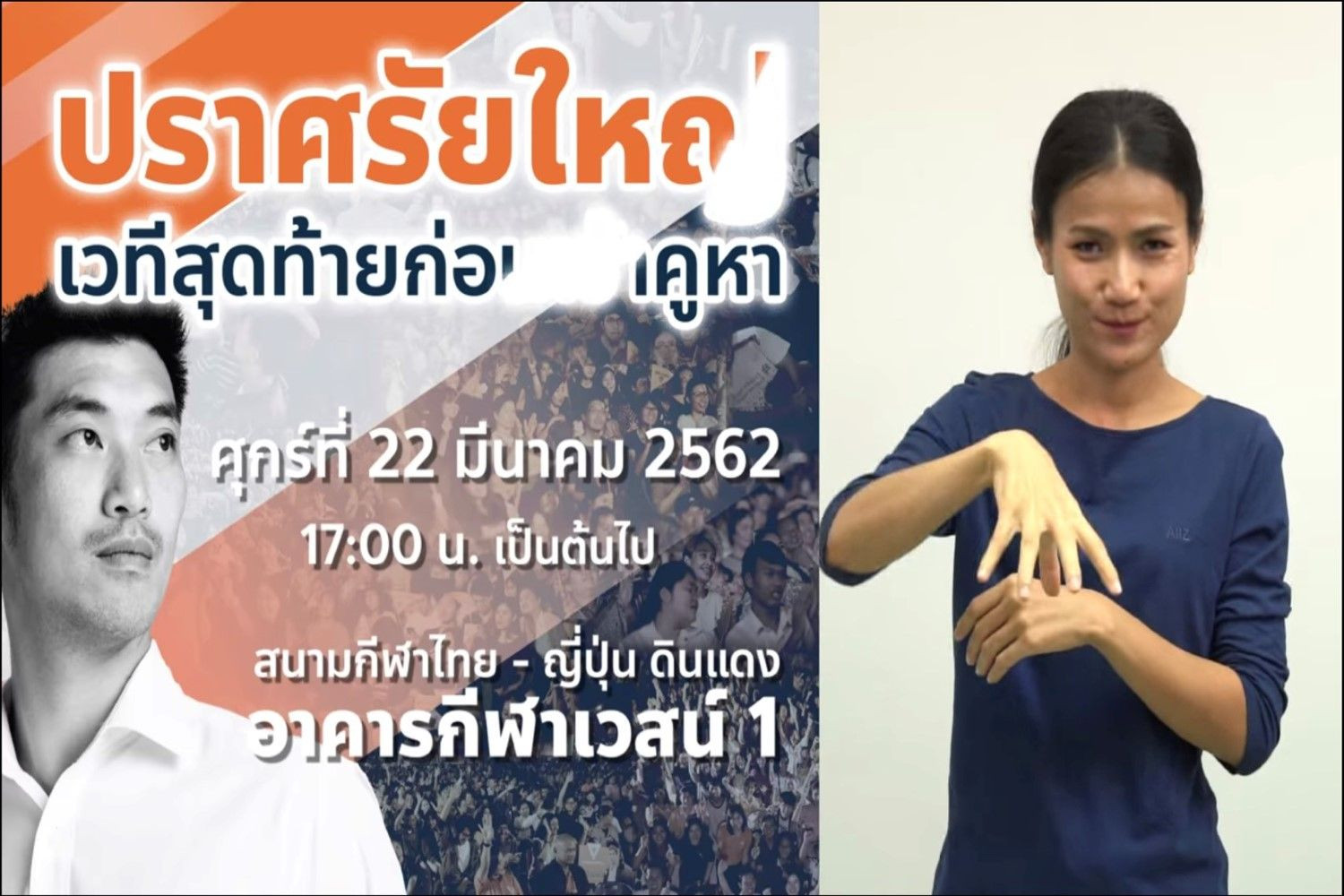 เมื่อวันที่ 21 มี.ค. 62 ผู้สื่อข่าวรายงานว่าเฟซบุ๊กแฟนเพจพรรคอนาคตใหม่ โพสต์วิดีโอคลิปประชาสัมพันธ์ "งานปราศรัยใหญ่พรรคอนาคตใหม่ เวทีสุดท้ายก่อนเข้าคูหา" ซึ่งจะมีขึ้นวันที่ที่ 22 มีนาคมนี้ 17.00 น. เป็นต้นไป ณ อาคารกีฬาเวสน์ 1 สนามกีฬาไทย-ญี่ปุ่น ดินแดง กรุงเทพมหานคร โดยเป็นลักษณะคลิปเสียงขึ้นข้อความ แต่ที่น่าสนใจคือ มีการเพิ่มภาษามือสำหรับผู้พิการทางการได้ยินด้วย ถือเป็นปรากฏการณ์ใหม่ในการรณรงค์หาเสียงของพรรคการเมืองไทย และเมื่อค้นย้อนกลับไปชมหลายๆ คลิปในเพจของพรรคอนาคตใหม่ ยังพบอีกว่า มีการทำคลิปนโยบาย รณรงค์ประชาสัมพันธ์ที่มีการเพิ่มภาษามือสำหรับผู้พิการทางการได้ยินมาแล้วหลายคลิป
