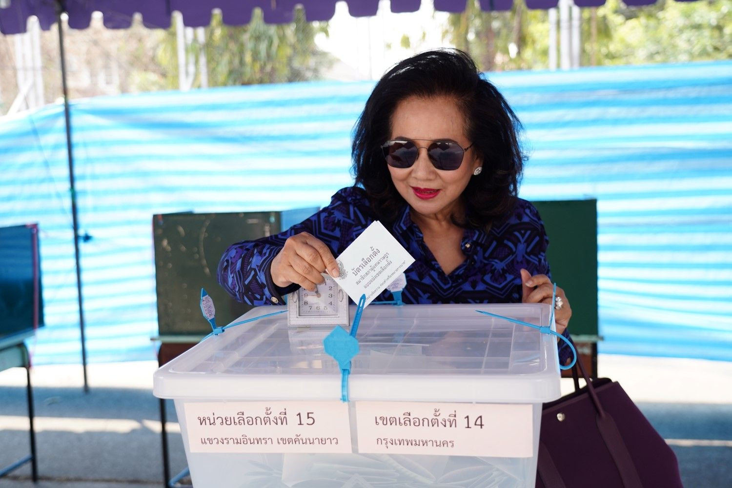 "คุณหญิงพจมาน" เดินทางมาใช้สิทธิเลือกตั้งที่ย่านคันนายาว ขณะที่ "อุ๊งอิ๊ง" ใช้สิทธิเลือกตั้งล่วงหน้าไปแล้วเมื่อ 17 มี.ค.