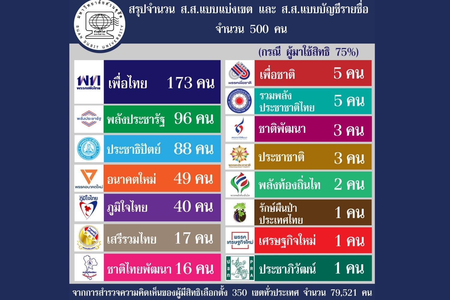เมื่อวันที่ 24 มี.ค. 62 สวนดุสิตโพล มหาวิทยาลัยสวนดุสิต เปิดเผยผลการสำรวจความคิดเห็นของผู้มีสิทธิเลือกตั้ง 350 เขตทั่วประเทศ จำนวน 79,521 คนในวันนี้ คาดว่าพรรคที่จะได้จำนวน ส.ส.แบบแบ่งเขตและแบบบัญชีรายชื่อมากสุดดังนี้ 1.พรรคเพื่อไทย 173 คน 2.พรรคพลังประชารัฐ96คน 3.พรรคประชาธิปัตย์ 88คน 4.พรรคอนาคตใหม่49 คน 5.พรรคภูมิใจไทย 40คน