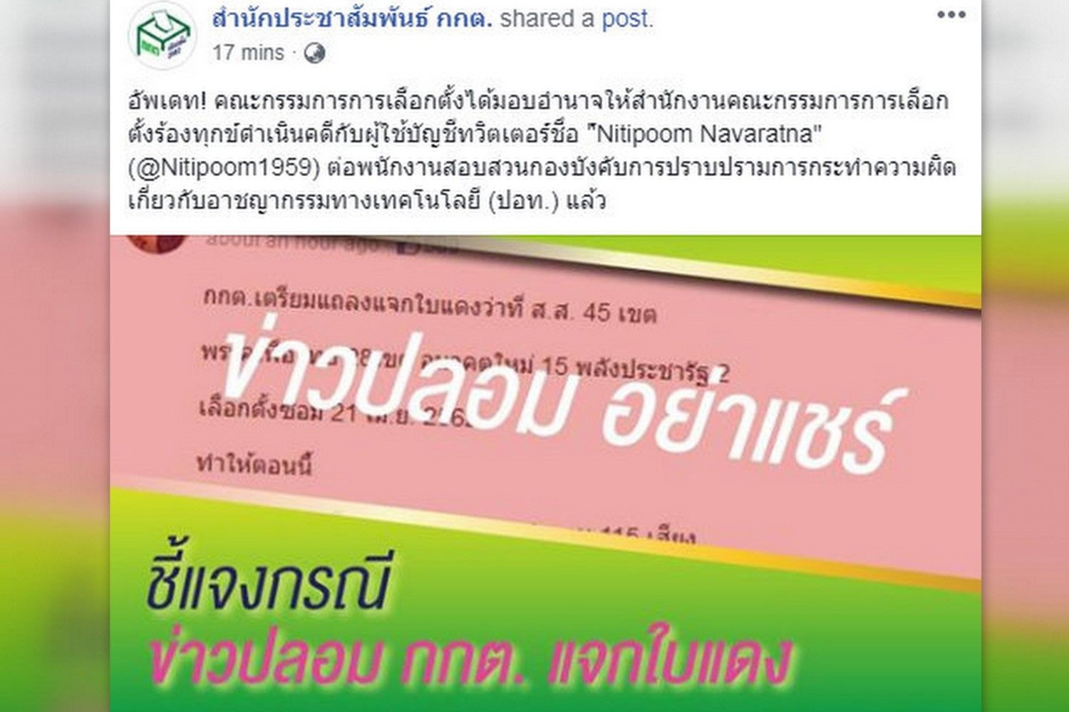 กกต.ส่งเจ้าหน้าที่แจ้งความดำเนินคดีผู้ใช้ทวิตเตอร์ชื่อ "Nitipoom Navaratna" ปมข่าวเท็จแจกใบแดง