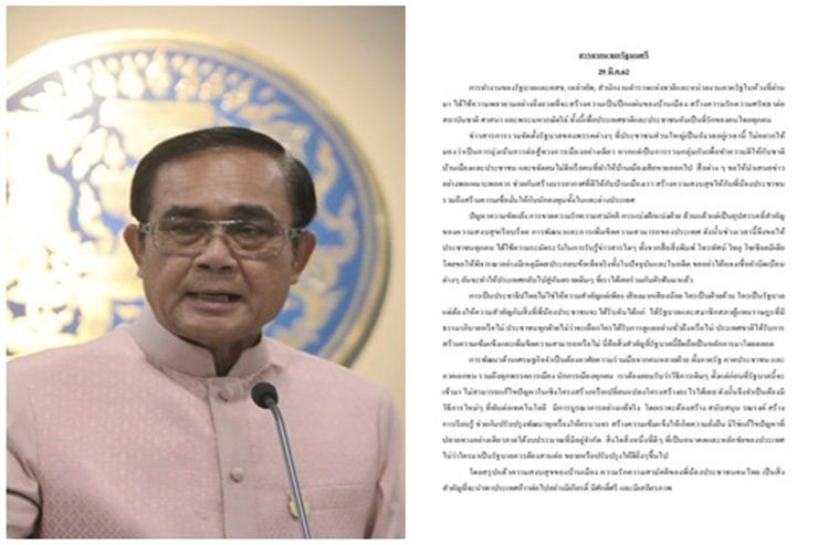 เมื่อวันที่ 29 มี.ค. พล.อ.ประยุทธ์ จันทร์โอชา นายกรัฐมนตรีและหัวหน้าคณะรักษาความสงบแห่งชาติ (คสช.) ส่งสารนายกรัฐมนตรี มีใจความตอนหนึ่ง ว่า  การเป็นประชาธิปไตยไม่ใช่ให้ความสำคัญแต่เพียงเสียงมากเสียงน้อย ใครเป็นฝ่ายค้าน ใครเป็นรัฐบาล แต่ต้องให้ความสำคัญกับสิ่งที่พี่น้องประชาชนจะได้รับอันได้แก่ ได้รัฐบาลและสมาชิกสภาผู้แทนราษฎรที่มีธรรมาภิบาลหรือไม่ ประชาชนทุกฝ่ายไม่ว่าจะเลือกใครได้รับการดูแลอย่างทั่วถึงหรือไม่ ประเทศชาติได้รับการสร้างความเข้มแข็งและเพิ่มขีดความสามารถหรือไม่ นี่คือสิ่งสำคัญที่รัฐบาลนี้ยึดถือเป็นหลักการมาโดยตลอด