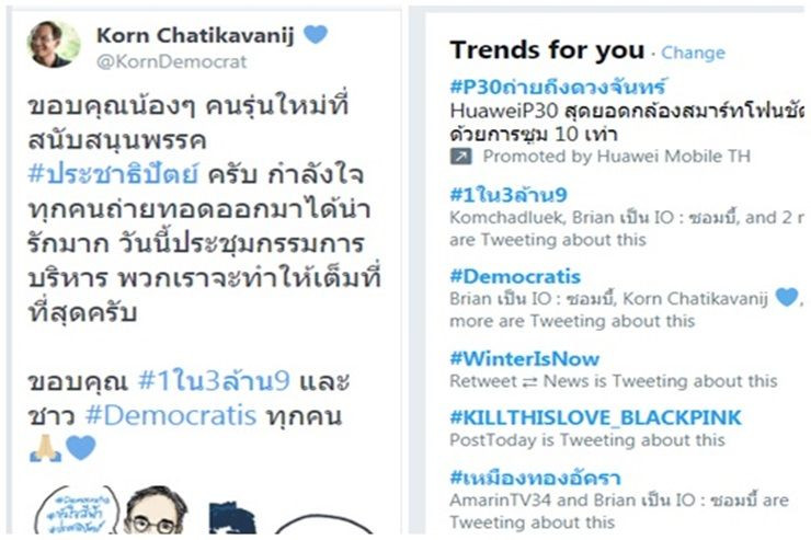 เมื่อวันที่ 29 มี.ค. ยังคงแรงต่อเนื่องสำหรับกระแสให้กำลังใจพรรคประชาธิปัตย์ โดยติดแฮชแทค #1ใน3ล้าน9 และข้อความให้กำลังใจให้การประชุมกรรมการบริหารพรรค ซึ่งปรากฎว่าเป็นเทรนด์ที่แซงทุกแฮชแทคทางการเมือง โดยติดอันดับ 1 ในทวิตเตอร์เมื่อช่วงบ่ายวันที่ 29 มีนาคม ที่ผ่านมา