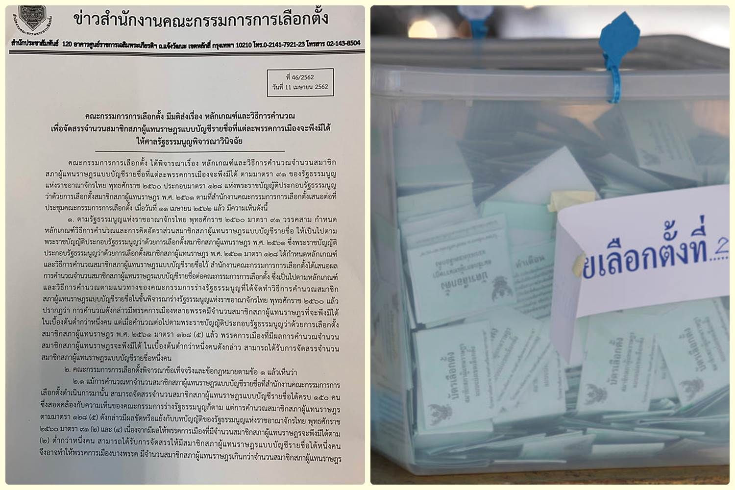 เมื่อวันที่ 11 เม.ย.62 คณะกรรมการการเลือกตั้ง(กกต.) มีมติส่งเรื่อง หลักเกณฑ์และวิธีการคำนวณเพื่อจัดสรรจำนวนสมาชิกสภาผู้แทนราษฎรแบบบัญชีรายชื่อที่แต่ละพรรคการเมืองจะพึงมีได้ ตามมาตรา 91 ของรัฐธรรมนูญ แห่งราชอาณาจักรไทย พุทธศักราช 2560 ประกอบมาตรา 128 แห่งพระราชบัญญัติประกอบรัฐธรรมนูญ ว่าด้วยการเลือกตั้งสมาชิกสภาผู้แทนราษฎร พ.ศ. 2561 ให้ศาลรัฐธรรมนูญพิจารณาวินิจฉัย