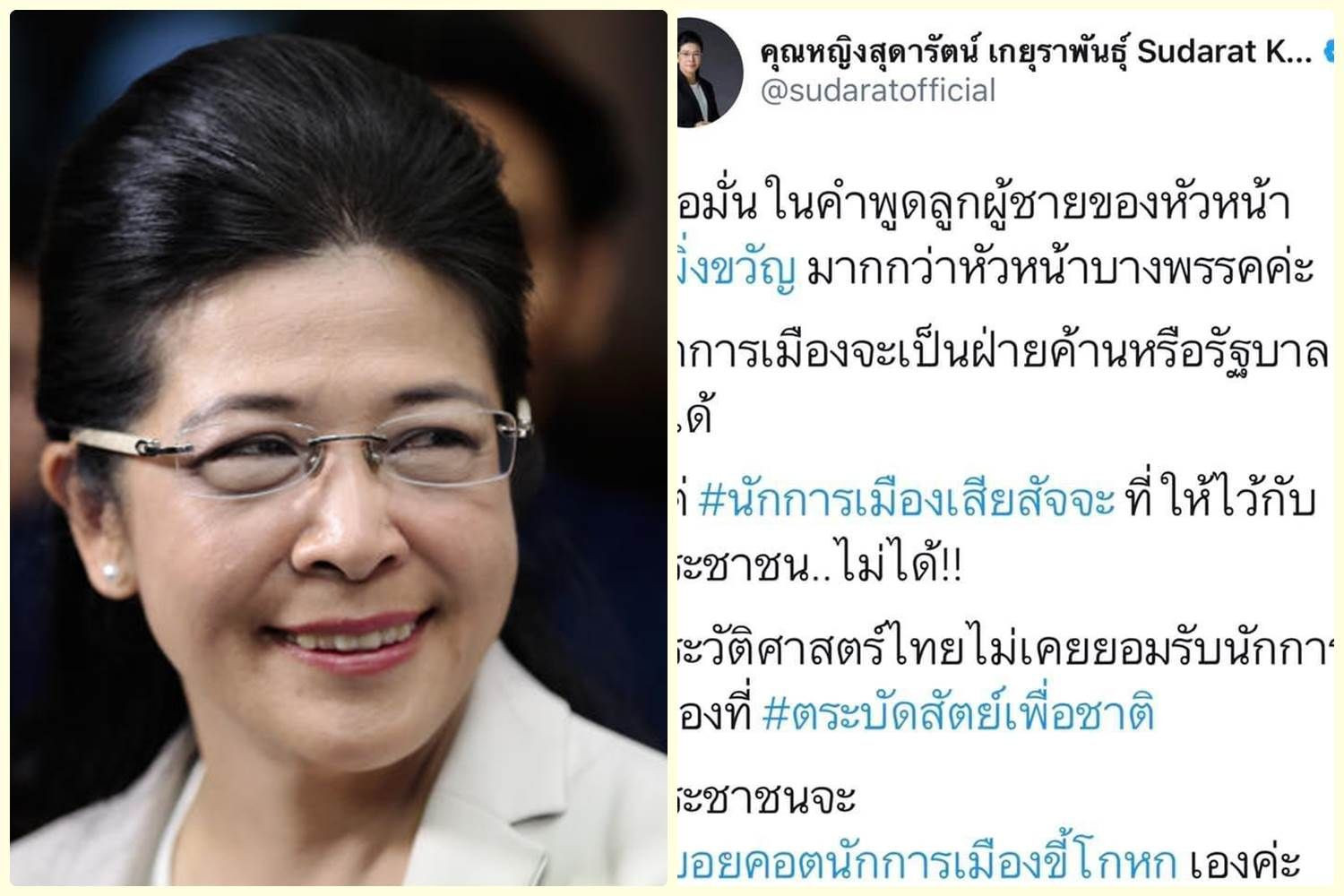 เมื่อวันที่ 13 เม.ย. คุุณหญิงสุดารัตน์ เกยุราพันธ์ ประธานยุทธศาสตร์การเลือกตั้งพรรคเพื่อไทย (พท.) ได้โพสต์ข้อความผ่านไอจี ระบุข้อความว่า "เชื่อมั่นในคำพูดลูกผู้ชายของหัวหน้า#มิ่งขวัญ มากกว่าหัวหน้าบางพรรคค่ะ