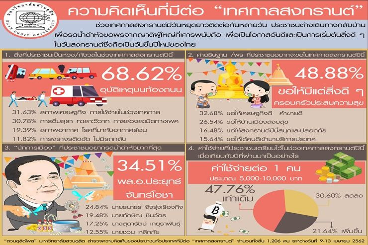 เมื่อวันที่ 14 เม.ย. “สวนดุสิตโพล” มหาวิทยาลัยสวนดุสิต เปิดเผยผลสำรวจความคิดเห็นของประชาชนทั่วประเทศที่มีต่อ “เทศกาลสงกรานต์” จำนวนทั้งสิ้น 1,206 คน ระหว่างวันที่ 9-13 เม.ย. 2562 สรุปผลได้ ดังนี้