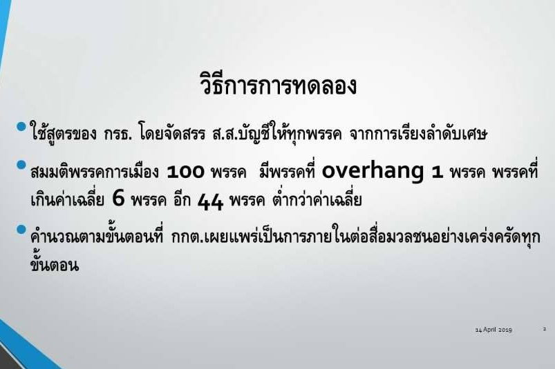 นายสมชัย ศรีสุทธิยากร สมาชิกพรรคประชาธิปัตย์ อดีตคณะกรรมการเลือกตั้ง (กกต.) โพสต์แสดงความเห็นผ่านเฟซบุ๊ก “ Somchai Srisutthiyakorn “ ระบุว่า ทดลองคำนวณในวันหยุดลองนำวิธีการคิด ส.ส.บัญชีรายชื่อตามวิธีที่ฝ่ายกรรมการร่างรัฐธรรมนูญ( กรธ.) และ สำนักงานกกต.คิดว่าแปลความตามรัฐธรรมนูญได้อย่างถูกต้อง โดยเอาเศษที่เหลือมาเรียงลำดับ และกระจายให้แก่ทุกพรรคที่มีเศษไปถึงโดยไม่สนใจว่าจะได้คะแนนเสียงจากประชาชนถึงเกณฑ์ค่าเฉลี่ย ส.ส.ที่พึงจะมีหรือไม่ โดยลองสมมติคะแนนของพรรคการเมือง 100 พรรค มีพรรคที่เกินค่าเฉลี่ยแค่ 6 พรรค อีก 44 พรรคต่ำกว่าค่าเฉลี่ย โดยให้มีคะแนนประมาณ 5,000 คะแนน ผลการทดลองปรากฎว่าหากใช้วิธีการของ กรธ. พรรคที่มีคะแนนประมาณ 5,000 คะแนนถึง 5 พรรค สามารถมี สส.บัญชีรายชื่อได้แบบสบายๆ