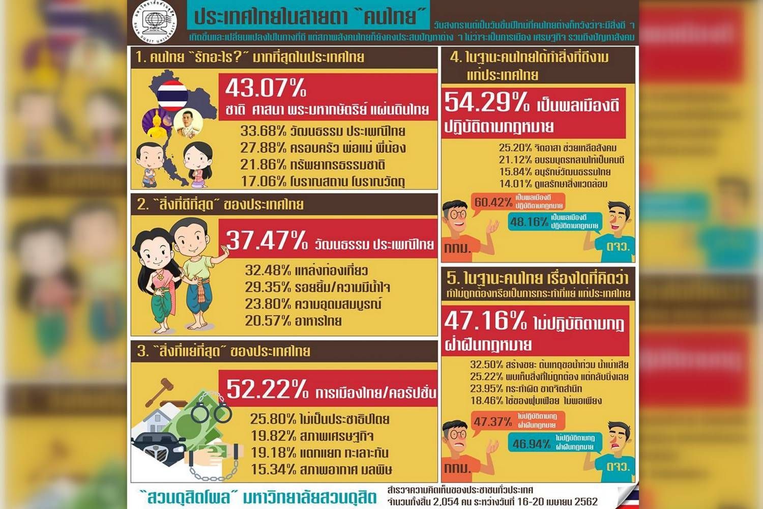 เมื่อวันที่ 21 เม.ย.62 สวนดุสิตโพล มหาวิทยาลัยสวนดุสิต เปิดเผยผลสำรวจเรื่อง ประเทศไทยในสายตาคนไทย โดยสำรวจความคิดเห็นประชาชนจำนวนทั้งสิ้น 2,054 คน ระหว่างวันที่ 16-20 เม.ย. 2562 ถึงมุมมองที่มีต่อประเทศไทยสรุปผลได้ดังนี้