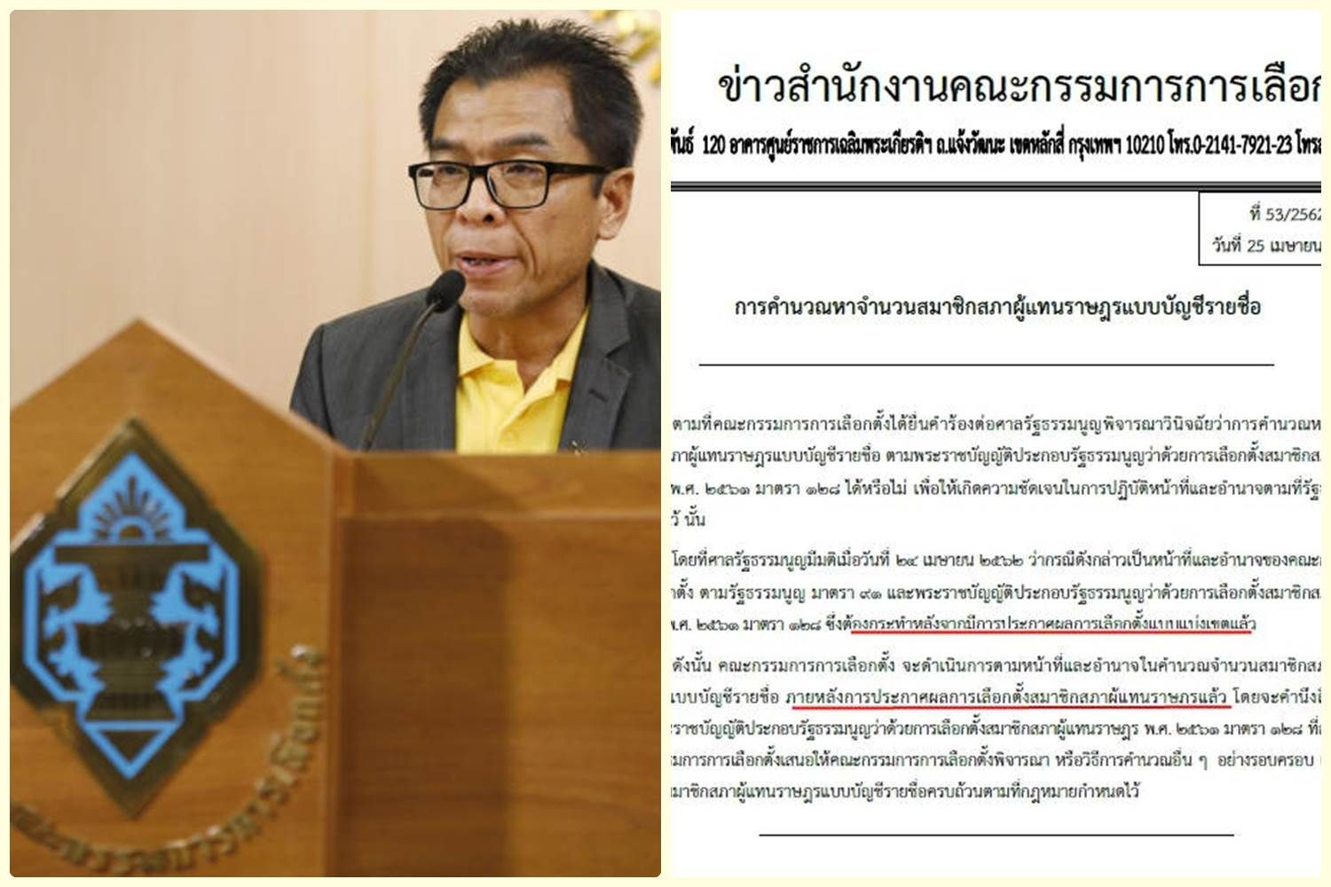 ภายหลังศาลรัฐธรรมนูญมีคำวินิจฉัยไม่รับคำร้องคณะกรรมการการเลือกตั้ง (กกต.) เกี่ยวกับการคำนวณส.ส.บัญชีรายชื่อ ต่อมาเมื่อวันที่ 25 เม.ย. กกต. ออกเอกสารข่าวชี้แจง พร้อมใช้อำนาจตามรัฐธรรมนูญ คำนวณส.ส.ระบบบัญชีรายชื่อ โดยยึดตามพ.ร.บ.ประกอบรัฐธรรมนูญว่าด้วยการเลือกตั้งสมาชิกสภาผู้แทนราษฎร พ.ศ.2561 มาตรา 128