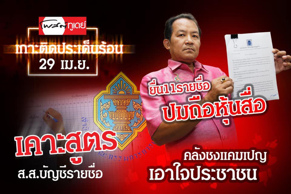 2. สำนักงานกกต.หัวกระไดไม่แห้งคงมีผู้เดินทางมาร้องเรียนปัญหาการเลือกตั้งที่ผ่านมา อย่างไรก็ตามต้องหลีกทางให้นักร้องขาประจำ "ศรีสุวรรณ จรรยา" เลขาธิการสมาคมองค์การพิทักษ์รัฐธรรมนูญไทย หอบแฟ้มรายชื่อ ว่าที่ ส.ส. จำนวน 11 คนถือหุ้นธุรกิจสื่อสารมวลชนเข้าข่ายลักษณะต้องห้ามการเป็นส.ส.ให้กกต.พิจารณา น่าสนใจ 2 ใน 11 รายชื่อเป็นว่าที่ส.ส.อนาคตใหม่อีกแล้ว