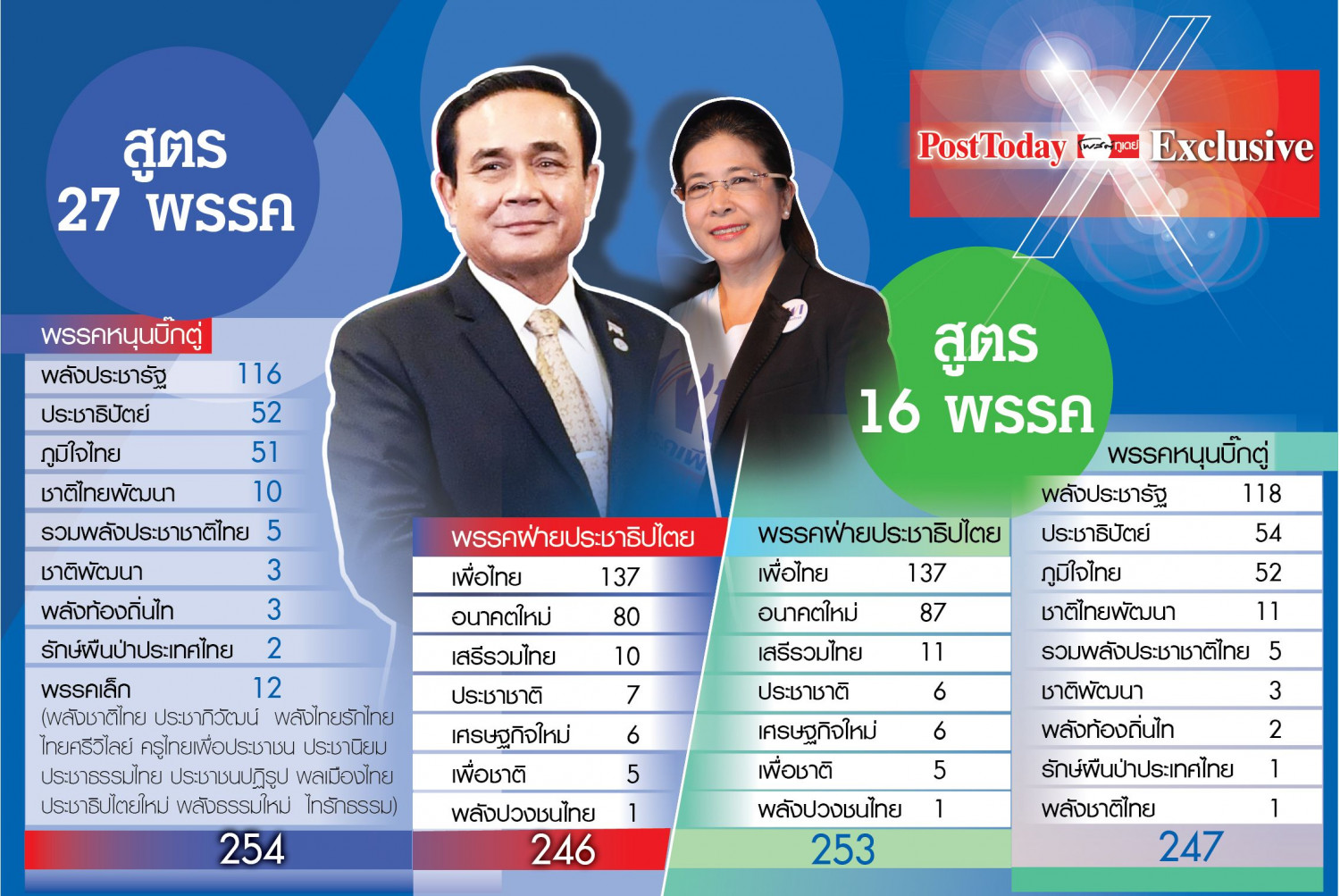 สูตรวิธีการคำนวณของ นายสมชัย ศรีสุทธิยากร และนายโคทม อารียา อดีตกกต.เสนอนั้น จะมี16พรรคการเมือง ที่จะได้ ส.ส. ซึ่งตอนนี้เรียกกันว่า "สูตร16พรรค "ซึ่งปรากฎว่าฝ่ายพรรคประชาธิปไตย 7 พรรค มีจำนวนส.ส.สูงถึง 253 ที่นั่ง ในขณะที่พรรคฝ่ายสนับสนุน พล.อ.ประยุทธ์ มีเพียง 247 เสียงเท่านั้น