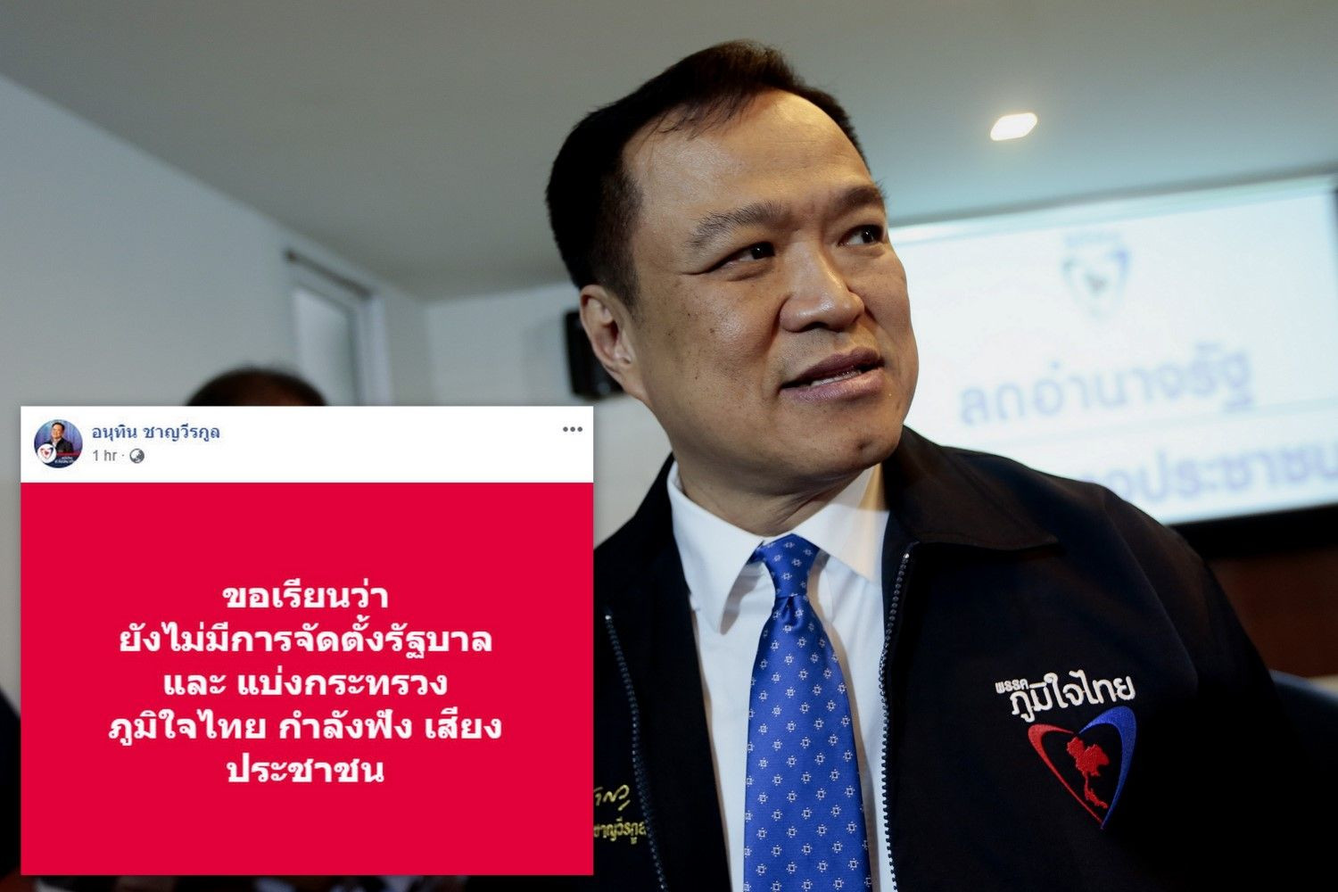 เมื่อวันที่ 9 พ.ค. 62 นายอนุทิน ชาญวีรกูล หัวหน้าพรรคภูมิใจไทยได้โพสต์ข้อความผ่านเฟซบุ๊กระบุว่า "ขอเรียนว่า ยังไม่มีการจัดตั้งรัฐบาล และแบ่งกระทรวง ภูมิใจไทย กำลังฟัง เสียงประชาชน"