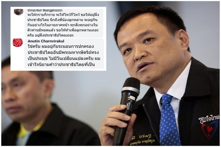 ขณะเดียวกันได้มีผู้ถามนายอนุทินว่าไม่จริงใช่ไหมครับคุณอนุทินอยู่ฝ่ายประชาธิปไตยใช่ไหมคับจะให้กราบก็กราบ จะให้ไหว้ก็ไหว้ ขอให้อยู่ฝั่งประชาธิปไตย นึกถึงพี่น้องลูกหลาน จะอยู่กินกันอย่างไรในภายภาคหน้า ทุกสิ่งทุกอย่างในตัวท่านมีหมดแล้ว ขอให้ทำเพื่อลูกหลานเถอะครับ อยู่ฝั่งประชาธิปไตยเถอะ ซึ่งนายอนุทิน ตอบว่าใช่ครับ ผมอยู่กับระบอบการปกครองประชาธิปไตยอันมีพระมหากษัตริย์ทรงเป็นประมุข ไม่มีวันเปลี่ยนแปลงครับ ผมเข้าใจนิยามคำว่าประชาธิปไตยที่เป็นประโยชน์สูงสุดของประเทศและประชาชนเป็นอย่างดีครับ