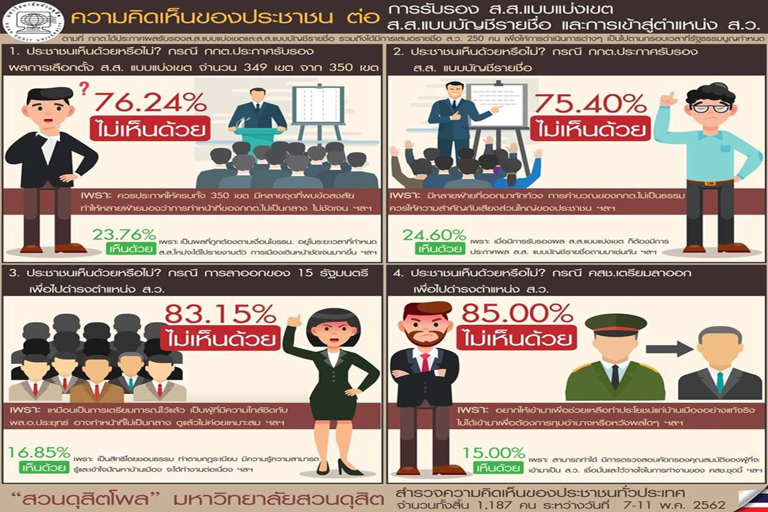 เมื่อวันที่ 12 พ.ค. 62 สวนดุสิตโพล มหาวิทยาลัยสวนดุสิต เปิดเผยผลสำรวจเรื่อง ความคิดเห็นประชาชน ต่อ การรับรอง ส.ส.แบบแบ่งเขต ส.ส.แบบบัญชีรายชื่อ และการเข้าสู่ตำแหน่ง ส.ว. โดยสำรวจความคิดเห็นของประชาชนทั่วประเทศ จำนวนทั้งสิ้น 1,187 คน ระหว่างวันที่ 7-11 พ.ค.62 สรุปผลได้ดังนี้