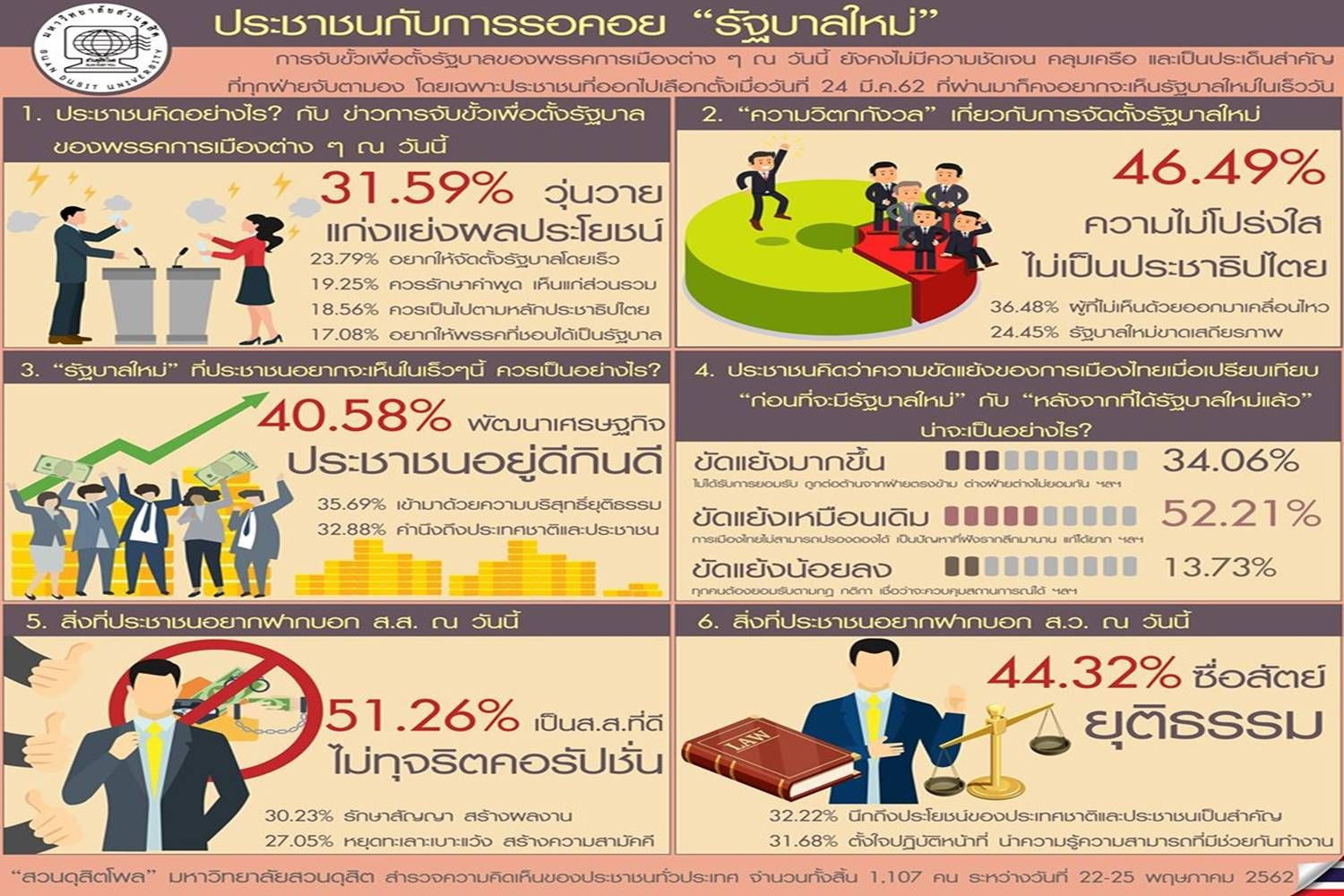 เมื่อวันที่ 26 พ.ค. 62 สวนดุสิตโพล มหาวิทยาลัยสวนดุสิต เปิดเผยผลสำรวจ เรื่อง “ประชาชนกับการรอคอย “รัฐบาลใหม่”” โดยสำรวจประชาชนทั่วประเทศจำนวนทั้งสิ้น 1,107 คน ระหว่างวันที่ 22-25 พ.ค.62 จากกรณีการจับขั้วเพื่อตั้งรัฐบาลของพรรคการเมืองต่างๆ ณ วันนี้ ยังคงไม่มีความชัดเจน คลุมเครือ และเป็นประเด็นสำคัญที่ทุกฝ่ายจับตามอง โดยเฉพาะประชาชนที่ออกไปเลือกตั้งเมื่อวันที่ 24 มี.ค.62 ที่ผ่านมา ก็คงอยากจะเห็นรัฐบาลใหม่ในเร็ววัน สรุปผลได้ ดังนี้