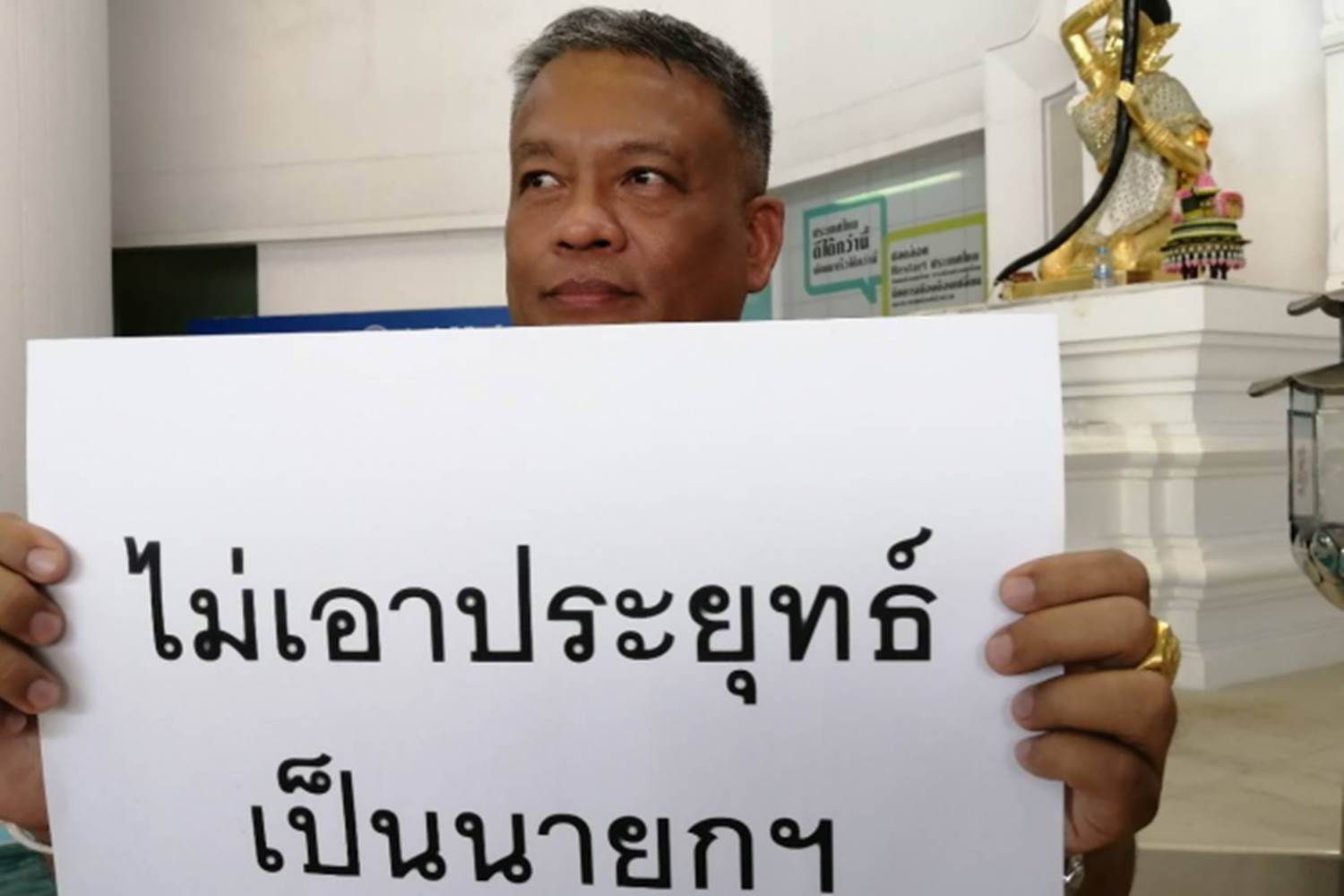 27 พ.ค.62 - เมื่อเวลา 13.00 น. ที่พรรคประชาธิปัตย์ ภายหลังจากที่แกนนำพรรคพลังประชารัฐ เดินทางกลับไปแล้ว นายวัชระ เพชรทอง อดีตส.ส.บัญชีรายชื่อ พรรคประชาธิปัตย์ ได้ ยกป้ายที่มีข้อความระบุว่า “ไม่เอาประยุทธ์เป็นนายกฯ” หน้าบริเวณลานพระแม่ธรณีบีบมวยผม เพื่อเป็นสัญลักษณ์ว่าตนเองไม่เห็นด้วยหากพรรคประชาธิปัตย์จะมีมติไปร่วมจัดตั้งรัฐบาลกับพรรคพลังประชารัฐ และสนับสนุนพล.อ.ประยุทธ์ จันทร์โอชา เป็นนายกรัฐมนตรี ต่ออีก