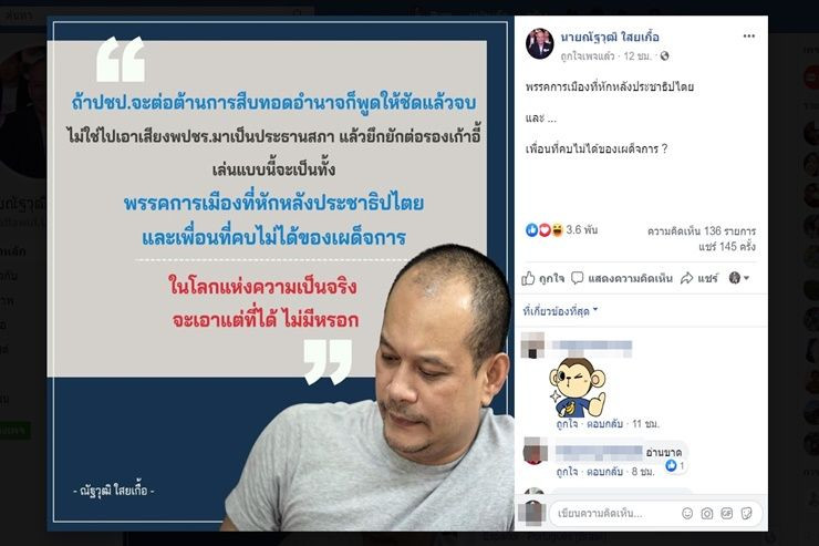 "ถ้า ปชป.จะต่อต้านการสืบทอดอำนาจก็พูดให้ชัดแล้วจบ ไม่ใช่ไปเอาเสียง พปชร.มาเป็นประธานสภา แล้วยึกยักต่อรองเก้าอี้ เล่นแบบนี้จะเป็นทั้ง พรรคการเมืองที่หักหลังประชาธิปไตย และเพื่อนที่คบไม่ได้ของเผด็จการ ในโลกแห่งความเป็นจริงจะเอาแต่ที่ได้ไม่มีหรอก"