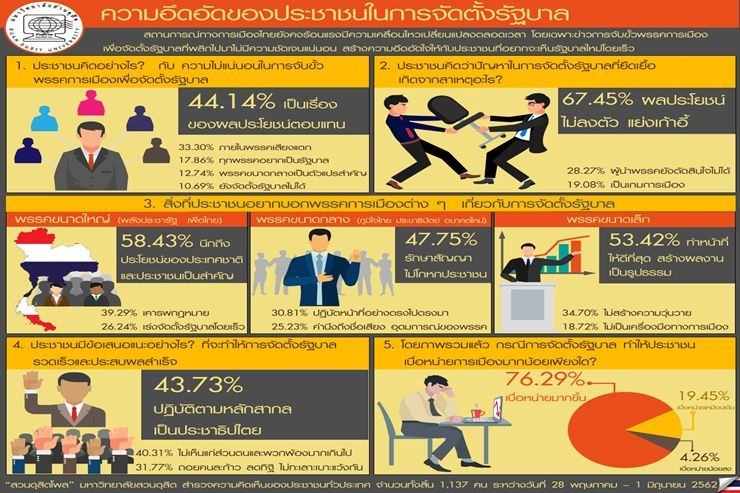 เมื่อวันที่ 2 มิ.ย. “สวนดุสิตโพล” มหาวิทยาลัยสวนดุสิต เปิดเผยผลสำรวจความคิดเห็นของประชาชนทั่วประเทศ ในหัวข้อ ความอึดอัดของประชาชนในการจัดตั้งรัฐบาล จำนวน ทั้งสิ้น 1,137 คน ระหว่างวันที่ 28 พฤษภาคม – 1 มิถุนายน 2562 สรุปผลได้ ดังนี้