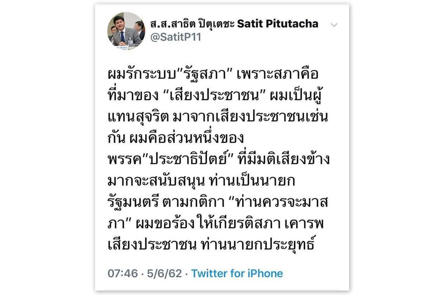 นายสาธิต ปิตุเตชะ รองหัวหน้าพรรคประชาธิปัตย์ (ปชป.) โพสต์ข้อความผ่านทวิเตอร์ว่า ผมรักระบบ”รัฐสภา” เพราะสภาคือที่มาของ “เสียงประชาชน” ผมเป็นผู้แทนสุจริต มาจากเสียงประชาชนเช่นกัน ผมคือส่วนหนึ่งของพรรค”ประชาธิปัตย์” ที่มีมติเสียงข้างมากจะสนับสนุน ท่านเป็นนายกรัฐมนตรี ตามกติกา “ท่านควรจะมาสภา” ผมขอร้องให้เกียรติสภา เคารพเสียงประชาชน ท่านนายกประยุทธ์