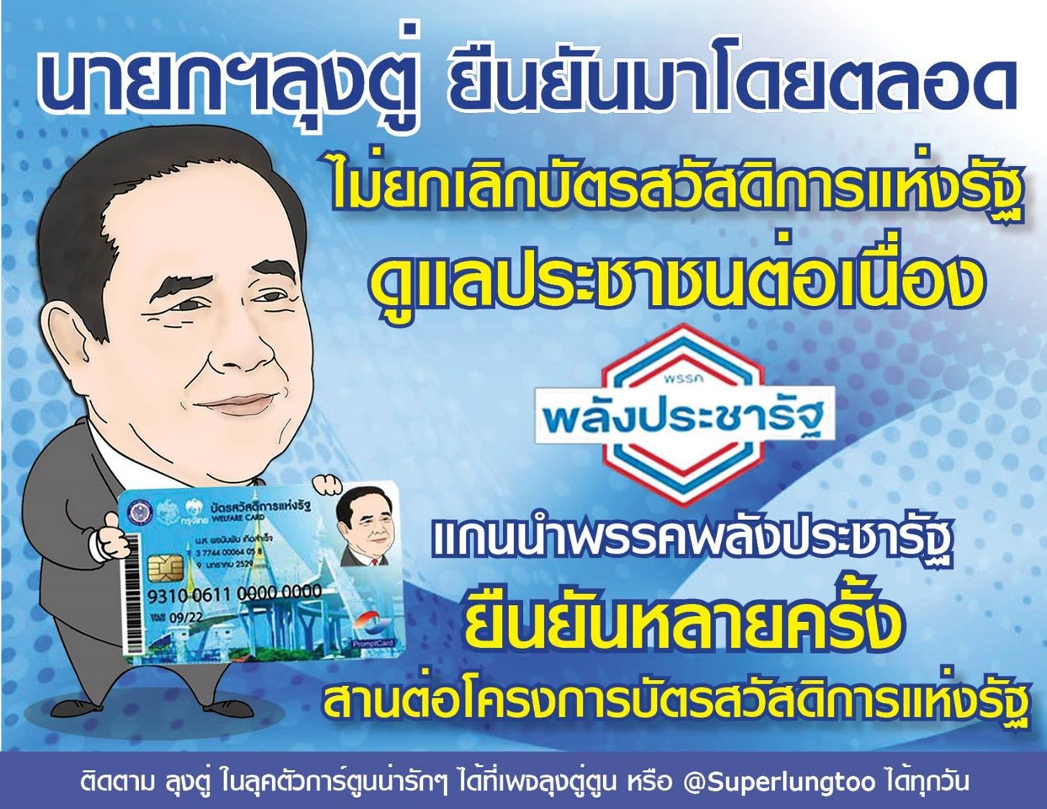 เพจลุงตู่ ตูน ยังโพสข้อความ ยืนยันขอให้น้องประชาชนที่ถือบัตรสวัสดิการแห่งรัฐ 14.5 ล้านคน ไม่ต้องกังวล รัฐบาลใหม่ยังคงเดินหน้าดูแลประชาชนผ่านโครงการบัตรสวัสดิการแห่งรัฐเหมือนเดิม