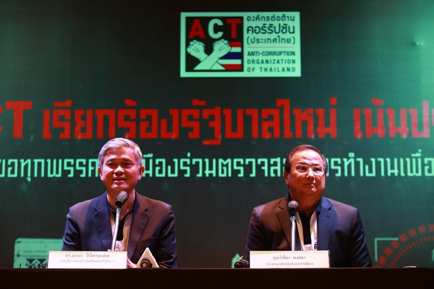 เมื่อวันที่ 13 มิ.ย. 62 องค์กรต่อต้านคอร์รัปชัน (ACT) แถลงข่าวหัวข้อ "เรียกร้องรัฐบาลใหม่ เน้นปราบโกง พร้อมขอทุกพรรคการเมืองร่วมตรวจสอบการทำงานเพี่อความโปร่งใส" โดยนายวิเชียร พงศธร ประธานองค์กรต่อต้านคอร์รัปชันและนายมานะ นิมิตมงคล เลขาธิการองค์กรต่อต้านคอร์รัปชัน