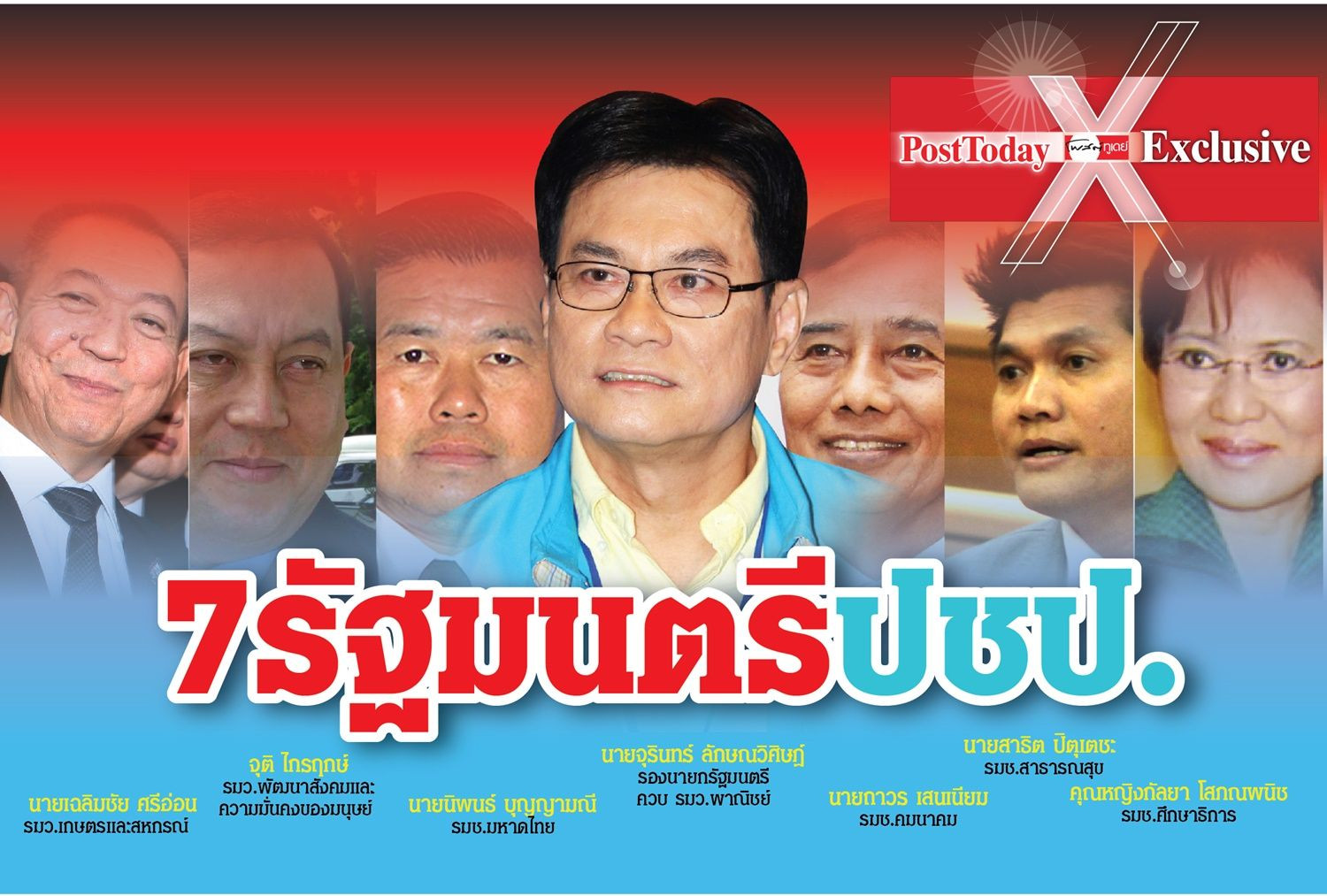 ทั้งนี้ รัฐมนตรีทั้ง 7 คน ประกอบด้วย นายจุรินทร์ ลักษณะวิศิษฏ์ เป็นรองนายกรัฐมนตรีควบรมว.พาณิชย์ นายเฉลิมชัย ศรีอ่อน เป็นรมว.เกษตรและสหกรณ์ นายนิพนธ์ บุญญามณี เป็นรมว.พัฒนาสังคมและความมั่นคงของมนุษย์ นายจุติ ไกรฤกษ์ เป็นรมช.มหาดไทย นายถาวร เสนเนียม เป็นรมช.คมนาคม คุณหญิงกัลยา โสภณพาณิชย์ เป็นรมช.ศึกษาธิการ และนายสาธิต ปิตุเตชะ เป็นรมช.สาธารณสุข