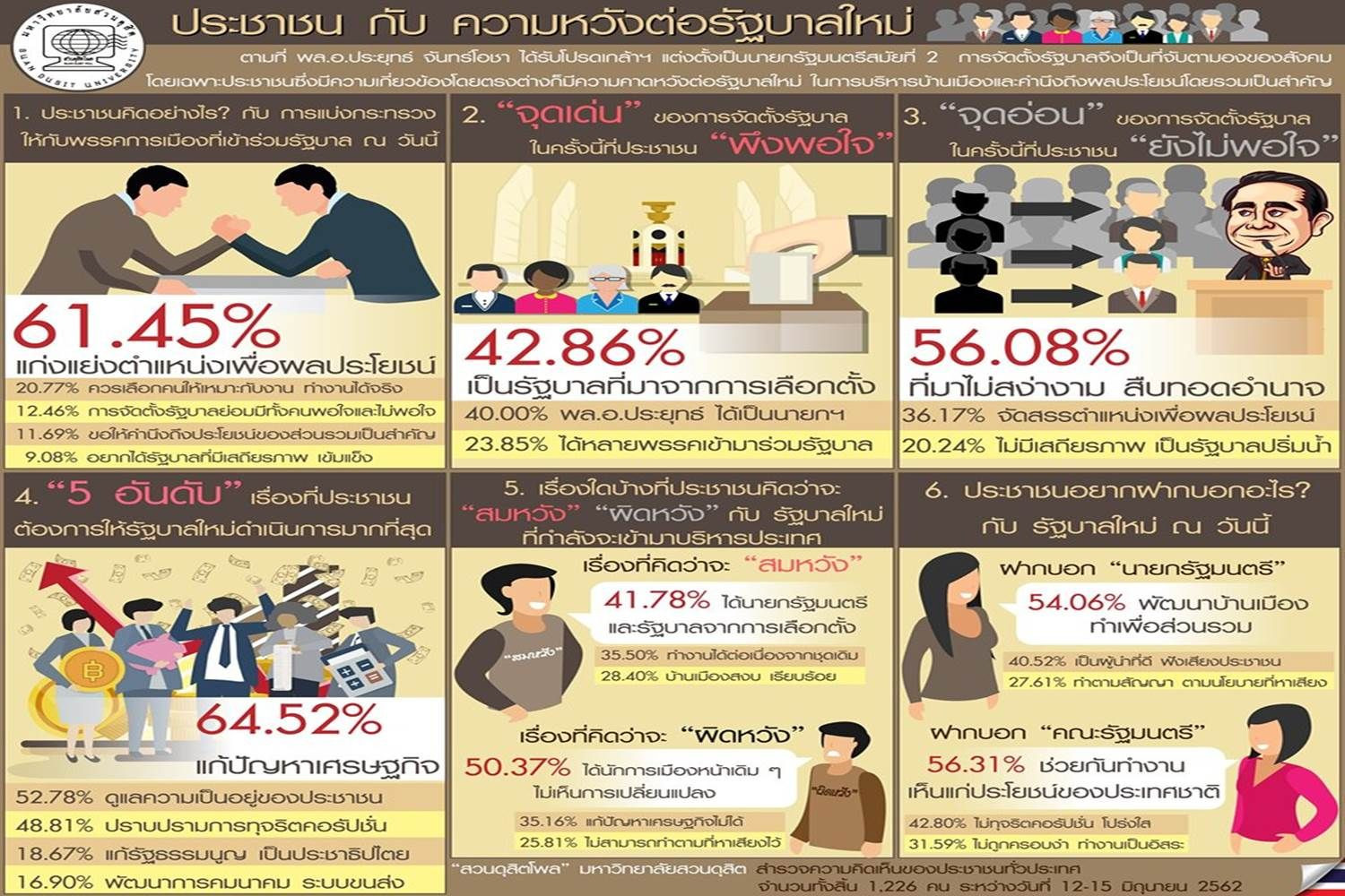 สวนดุสิตโพล มหาวิทยาลัยสวนดุสิต เปิดเผยผลสำรวจความคิดเห็นเรื่อง "ประชาชน กับ ความหวังต่อรัฐบาลใหม่" โดยสำรวจกลุ่มตัวอย่างจำนวนทั้งสิ้น 1,226 คน ระหว่างวันที่ 12-15 มิถุนายน 2562 เพื่อสะท้อนความคิดเห็นของประชาชนที่สนใจติดตามข่าวการเมือง จากกรณี พล.อ.ประยุทธ์ จันทร์โอชา ได้รับโปรดเกล้าฯ แต่งตั้งเป็นนายกรัฐมนตรีสมัยที่ 2 การจัดตั้งรัฐบาล จึงเป็นที่จับตามองของสังคม โดยเฉพาะประชาชนซึ่งมีความเกี่ยวข้องโดยตรงต่างก็มีความคาดหวังต่อรัฐบาลใหม่ ในการบริหารบ้านเมืองและคำนึงถึงผลประโยชน์โดยรวมเป็นสำคัญ สรุปผลได้ดังนี้