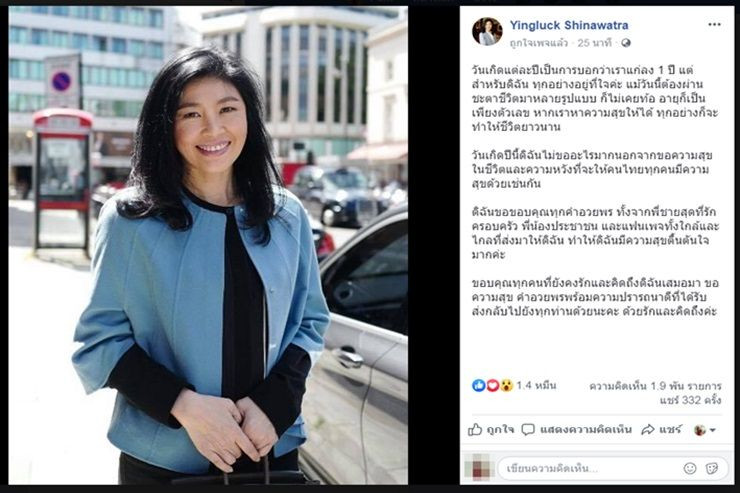 เมื่อวันที่ 21 มิ.ย. น.ส.ยิ่งลักษณ์ ชินวัตร อดีตนายกรัฐมนตรี โพสต์ข้อความทางเฟซบุ๊ก ว่า "วันเกิดแต่ละปีเป็นการบอกว่าเราแก่ลง 1 ปี แต่สำหรับดิฉัน ทุกอย่างอยู่ที่ใจค่ะ แม้วันนี้ต้องผ่านชะตาชีวิตมาหลายรูปแบบ ก็ไม่เคยท้อ อายุก็เป็นเพียงตัวเลข หากเราหาความสุขให้ได้ ทุกอย่างก็จะทำให้ชีวิตยาวนาน