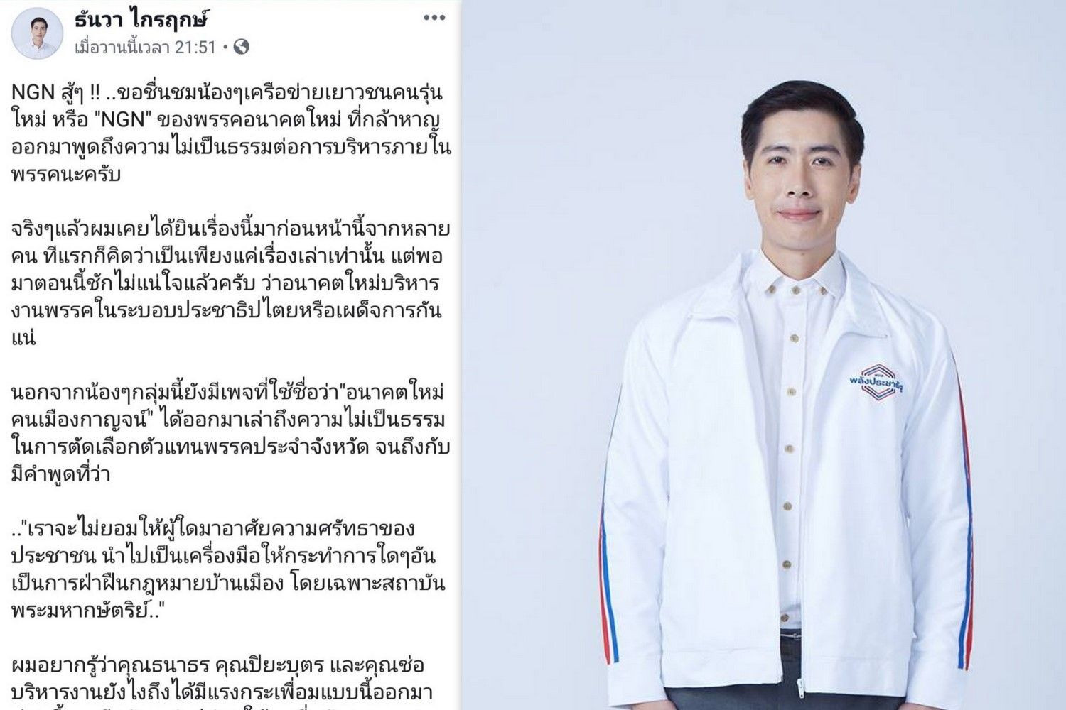 เมื่อวันที่ 25 มิ.ย. 62 นายธันวา ไกรฤกษ์  อดีตผู้สมัคร ส.ส. เขตสวนหลวง-เขตประเวศ พรรคพลังประชารัฐ โพสต์เฟซบุ๊กให้กำลังใจกลุ่ม NGN พรรคอนาคตใหม่ โดยมีเนื้อหาดังนี้
