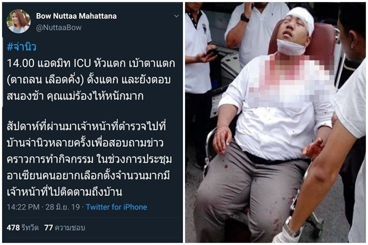 เมื่อเวลา 14.22 น. วันที่ 28 มิ.ย. น.ส.ณัฏฐา มหัทธนา หรือ โบว์ แกนนำกลุ่มคนอยากเลือกตั้ง ได้ทวิตข้อความถึงความคืบหน้า กรณี นายสิรวิชญ์ เสรีธิวัฒน์ หรือ จ่านิว นักเคลื่อนไหวทางการเมือง ถูกชาย 4 คนรุมทำร้ายบริเวณปากซอยพระยาสุเรนทร์ ซอย 2 ว่า ขณะนี้จ่านิวได้แอดมิทที่ห้องไอซียู อาการเบื้องต้น หัวแตก เบ้าตาแตก (ตาถลน เลือดคั่ง) ดั้งแตกและยังตอบสนองช้า คุณแม่ร้องไห้หนักมาก