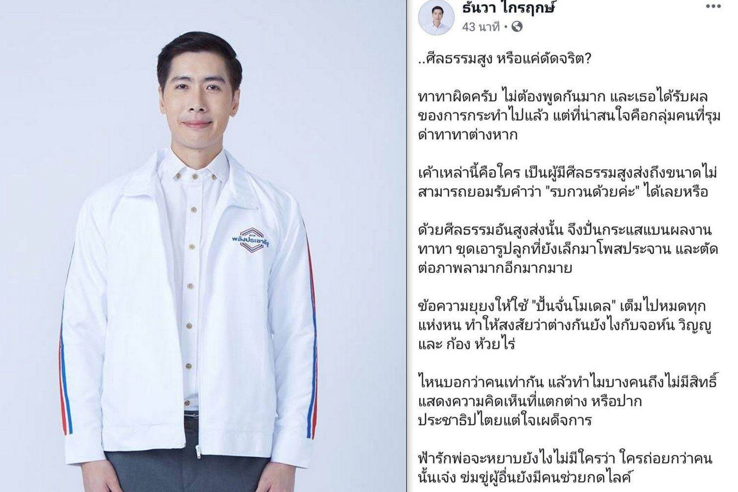 เมื่อวันที่ 9 ก.ค. 62 นายธันวา ไกรฤกษ์ อดีต ผู้สมัครส.ส. เขตสวนหลวง-เขตประเวศ พรรค พลังประชารัฐ โพสต์เฟซบุ๊คส่วนตัว ระบุว่า ศีลธรรมสูง หรือแค่ดัดจริต?