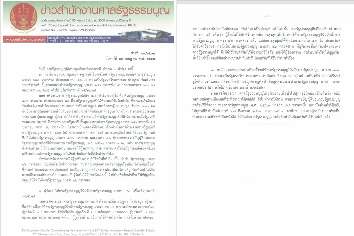 ล่าสุด ศาลรัฐธรรมมีมติรับคำร้องนี้ไว้วินิจฉัย แต่ไม่เข้าเงื่อนไขที่จะสั่งให้ผู้ถูกร้องคือ พล.อ.ประยุทธ์หยุดปฏิบัติหน้าที่ตามรัฐธรรมนูญ มาตรา 82 วรรคสอง