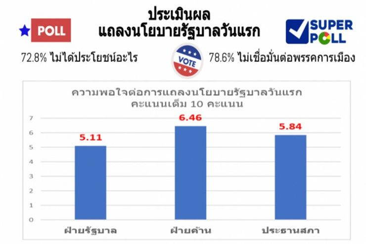 สำนักวิจัย ซูเปอร์โพล เผย ประชาชน 72.8 % ระบุไม่ได้ประโยชน์แถลงนโยบายรัฐบาล ขณะที่ 78.6% ไม่เชื่อมั่นพรรคการเมืองจะทำตามนโยบายหาเสียง