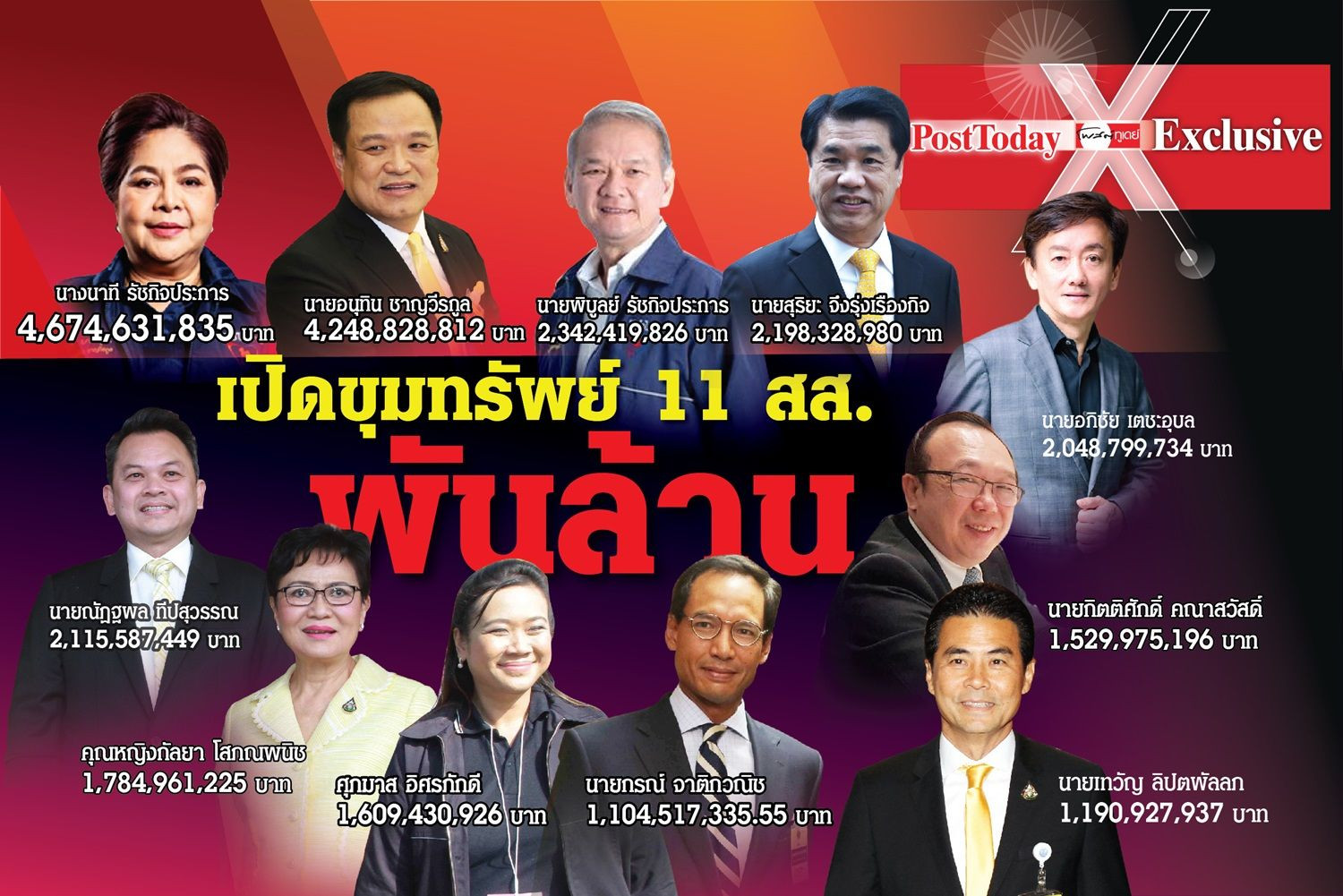 หลังคณะกรรรมการป้องกันและปราบปรามการทุจริตแห่ง(ป.ป.ช.) ได้ทำการเปิดเผยบัญชีแสดงรายการทรัพย์สินและหนี้สินของส.ส.กรณีเข้ารับตำแหน่ง414 ราย พบว่า มี ส.ส.ที่มีทรัพย์สินเกิน1,000 ล้านบาทถึง 11 คน ซึ่งมาจากส.ส.ฝ่ายรัฐบาล10 คน และฝ่ายค้าน 1คน