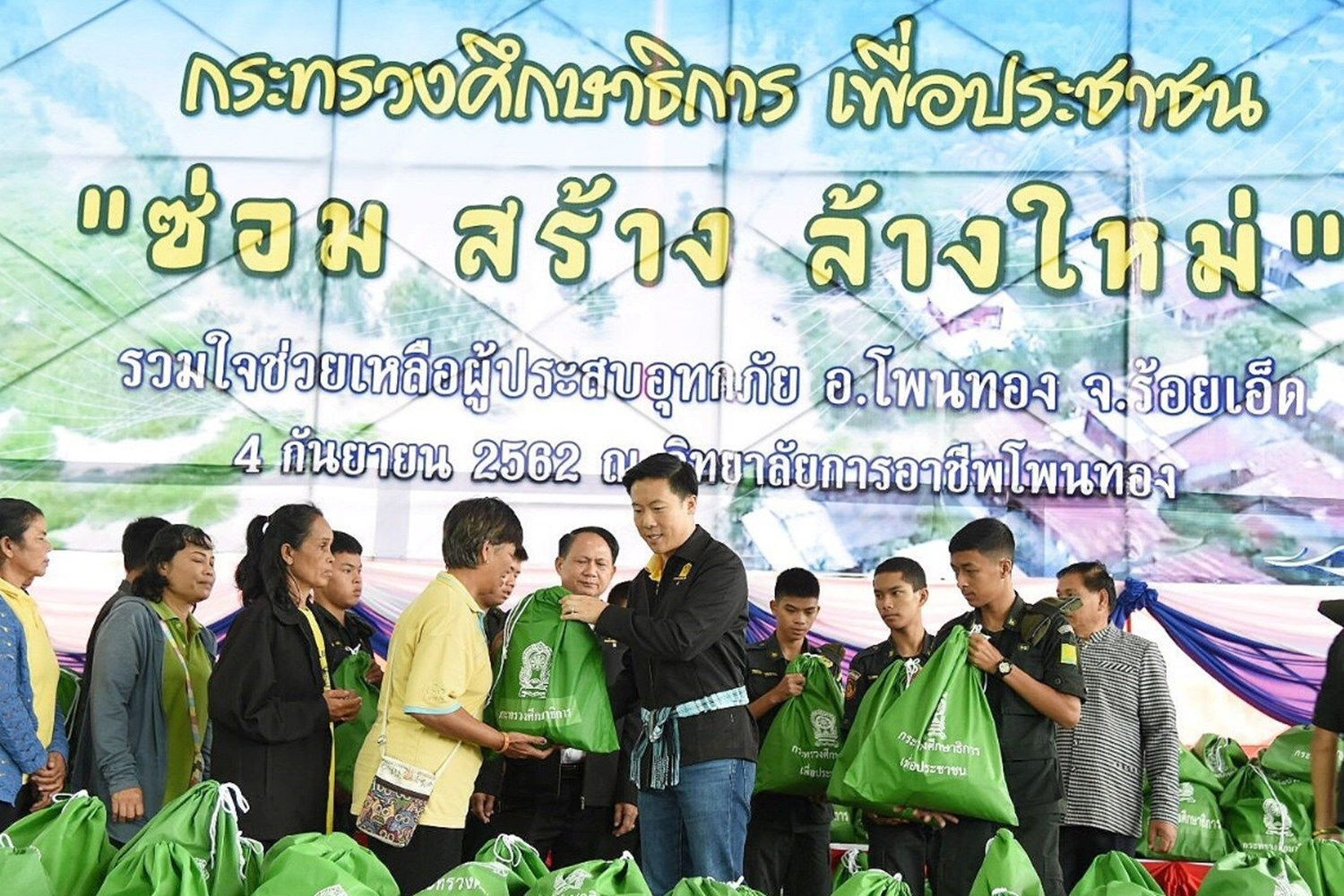เมื่อวันที่ 4 ก.ย.นายณัฐพล ทีปสุวรรณ รมว.ศึกษาธิการ(ศธ.) กล่าวว่า ได้ส่งทีมช่วยเหลือประชาชนที่ได้รับผลกระทบจากพายุโพดุลลงพื้นที่แรกภาคอีสาน จ.ร้อยเอ็ด พร้อมนำถุงยังชีพกว่า 1,000 ถุงแจกจ่ายบรรเทาทุกข์เบื้องต้น และเปิดโครงการ “กระทรวงศึกษาธิการเพื่อประชาชน ซ่อม สร้าง ล้าง ใหม่” 20จุด ช่วยเหลือประชาชน โดยดึงวิทยาลัยอาชีวศึกษาและหน่วยงานการศึกษา นอกโรงเรียนหรือ กศน. เปิดศูนย์ช่วย “ซ่อม-สร้าง ล้าง ใหม่” เพื่อช่วยเหลือบ้านเรือนที่อยู่อาศัยของประชาชนที่ได้รับความเสียหายจากน้ำท่วม