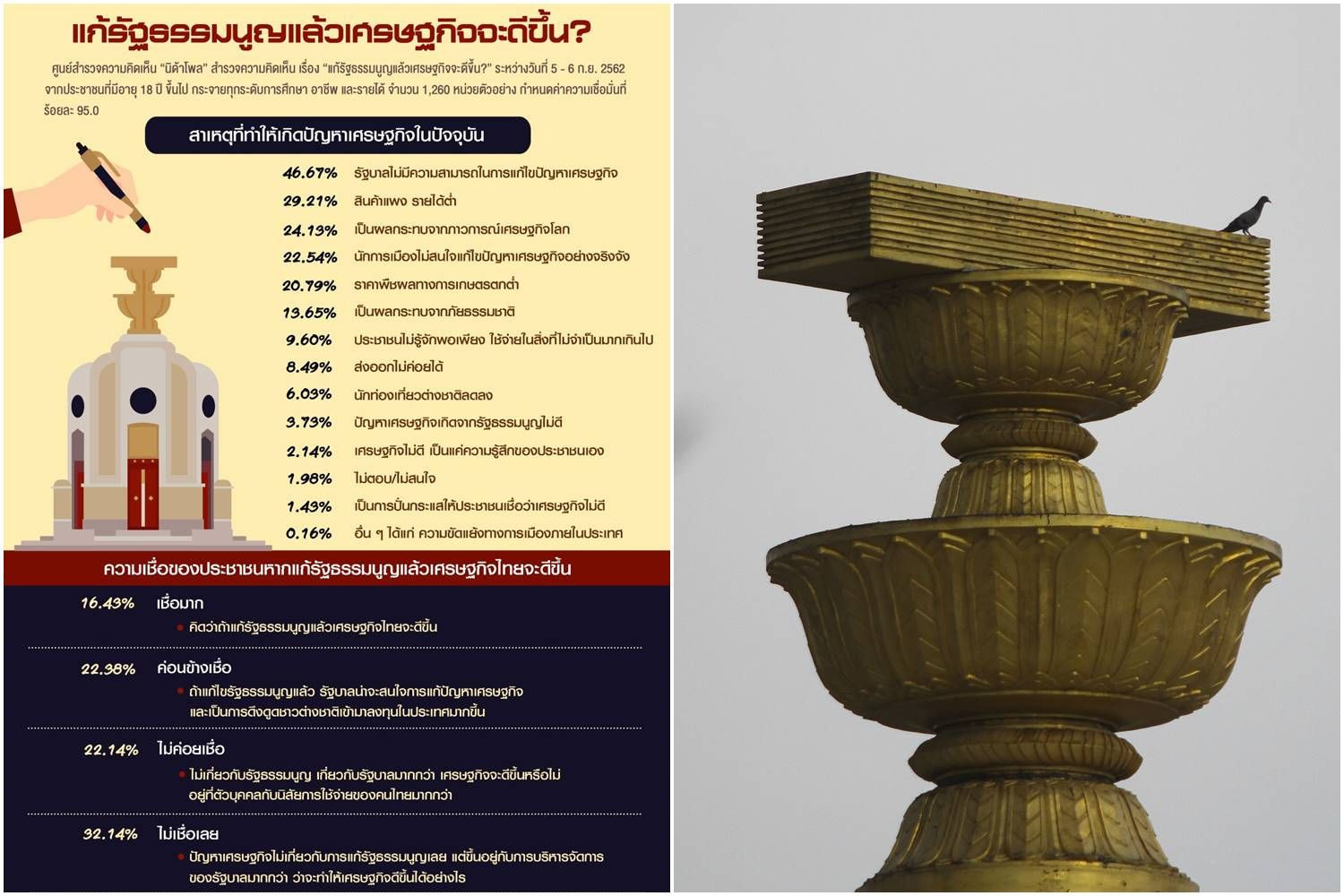 ศูนย์สำรวจความคิดเห็น “นิด้าโพล” สถาบันบัณฑิตพัฒนบริหารศาสตร์ (นิด้า) สำรวจความคิดเห็นของประชาชน เรื่อง “แก้รัฐธรรมนูญแล้วเศรษฐกิจจะดีขึ้น?” ทำการสำรวจระหว่างวันที่ 5 – 6 กันยายน 2562 จากประชาชนที่มีอายุ 18 ปีขึ้นไป กระจายทุกภูมิภาค ระดับการศึกษา และอาชีพทั่วประเทศ รวมทั้งสิ้น จำนวน 1,260 หน่วยตัวอย่าง เกี่ยวกับสาเหตุที่ทำให้เกิดปัญหาเศรษฐกิจในปัจจุบัน และความเชื่อของประชาชนหากแก้รัฐธรรมนูญแล้วเศรษฐกิจไทยจะดีขึ้นหรือไม่