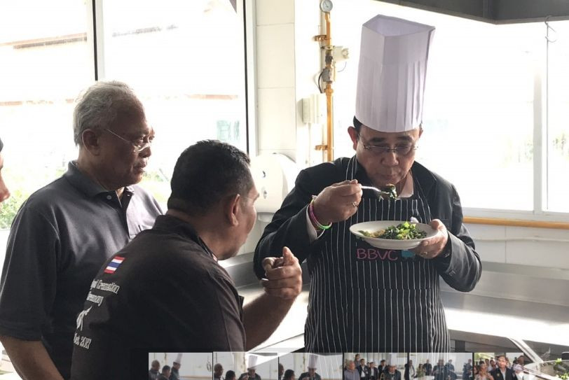 ทั้งนี้ พล.อ.ประยุทธ์ ได้มาเยี่ยมชมห้องประกอบอาหาร ขณะที่เชฟประจำวิทยาลัยฯ ได้นำผ้ากันเปื้อนปักข้อความว่า “เชฟตู่” ก่อนลงมือทำเมนูใบเหลียงผัดไข่ ซึ่งเป็นเมนูที่นายกฯ ระบุว่าชื่นชอบ กินเป็นประจำ ซึ่งยังระบุถึงส่วนผสมสำคัญคือ ชาติ ศาสนา พระมหากษัตริย์ และระบุอีกว่า “ปกติสมัยเป็นทหาร ได้ทำอาหารกินเองกับพี่ป๊อก (พล.อ.อนุพงษ์ เผ่าจินดา รมว.มหาดไทย) ต้ม แกง ผัดทำได้หมด โดยเฉพาะตอนตังค์หมดก็จะทำกินกันเอง” ขณะเดียวกันนายกฯ ยังได้เยี่ยมชมห้องประกอบอาหารจีนและเบเกอรี่ พร้อมกับได้ชิมอย่างอารมณ์ดี