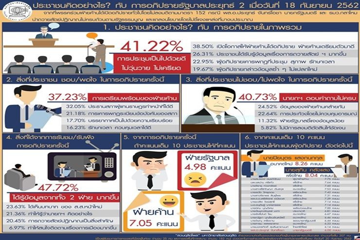 การอภิปรายในภาพรวม อันดับ 1 หรือ 41.22% เห็นว่าภาพรวมการประชุมเป็นไปด้วยดี ไม่วุ่นวาย ไม่เครียด อันดับ 2 หรือ 38.50% เห็นว่าเป็นการเปิดโอกาสให้ฝ่ายค้านได้อภิปราย ฝ่ายค้านเตรียมตัวมาดี อันดับ 3 หรือ 26.31% เห็นว่า ประชาชนได้รับรู้ข้อมูลและเข้าใจเรื่องการถวายสัตย์มากขึ้น อันดับ 4 หรือ 22.95% เห็นว่าผู้อภิปรายเคารพกฎที่ประชุม สุภาพ รักษาเวลา  อันดับ 5 หรือ 19.67% เห็นว่า ผู้อภิปรายกล่าวข้อมูลซ้ำ ๆ ไม่แปลกใหม่