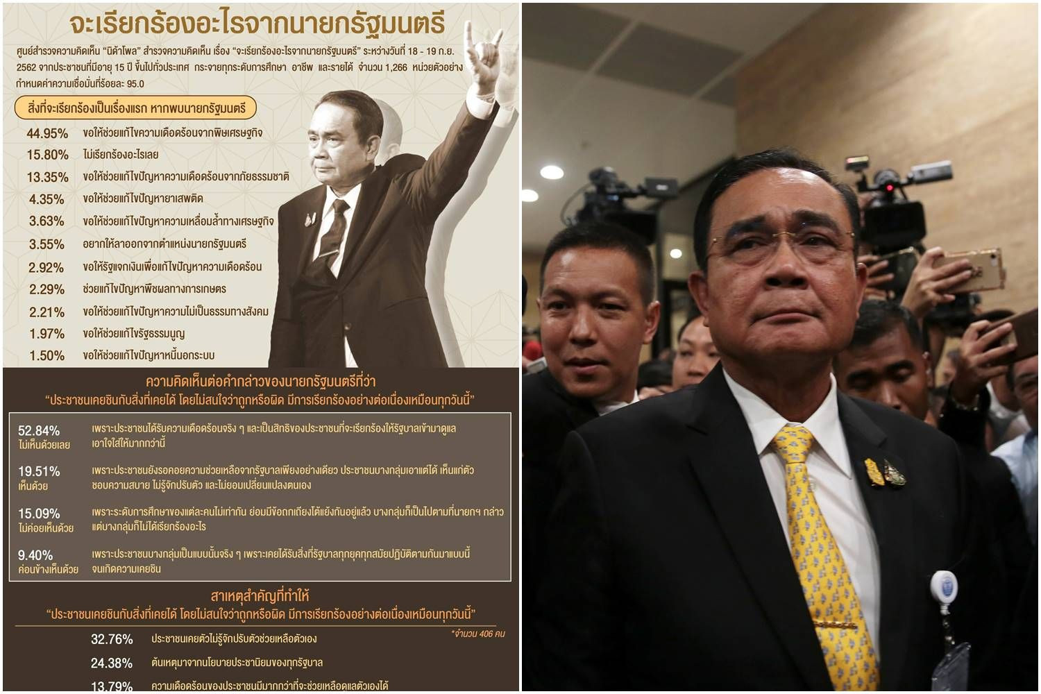 ศูนย์สำรวจความคิดเห็น “นิด้าโพล” สถาบันบัณฑิตพัฒนบริหารศาสตร์ (นิด้า) เปิดเผยผลสำรวจของประชาชน เรื่อง “จะเรียกร้องอะไรจากนายกรัฐมนตรี” ทำการสำรวจระหว่างวันที่ 18 – 19 กันยายน 2562 จากประชาชนที่มีอายุ 15 ปีขึ้นไป กระจายทุกภูมิภาค ระดับการศึกษา และอาชีพทั่วประเทศ รวมทั้งสิ้น จำนวน 1,266 หน่วยตัวอย่าง เกี่ยวกับสิ่งที่จะเรียกร้องจากนายกรัฐมนตรี และสาเหตุสำคัญที่ทำให้ประชาชนเคยชินกับสิ่งที่เคยได้